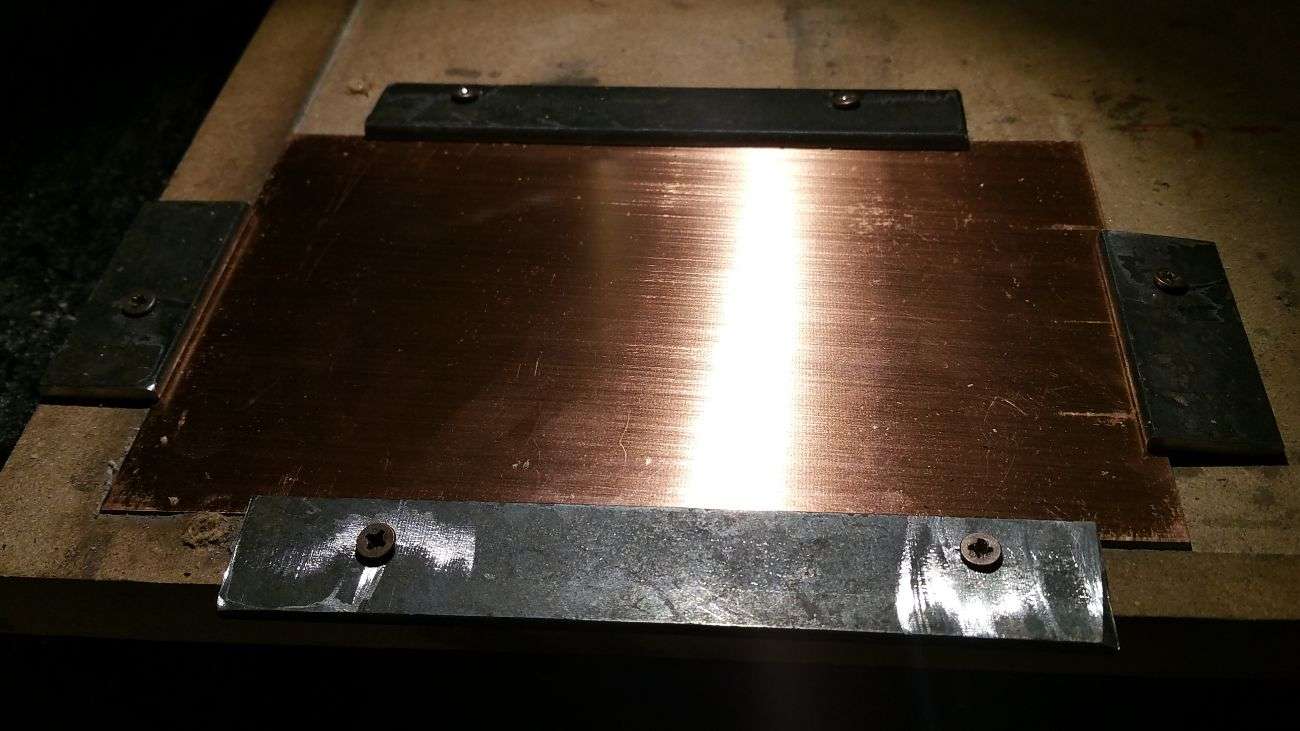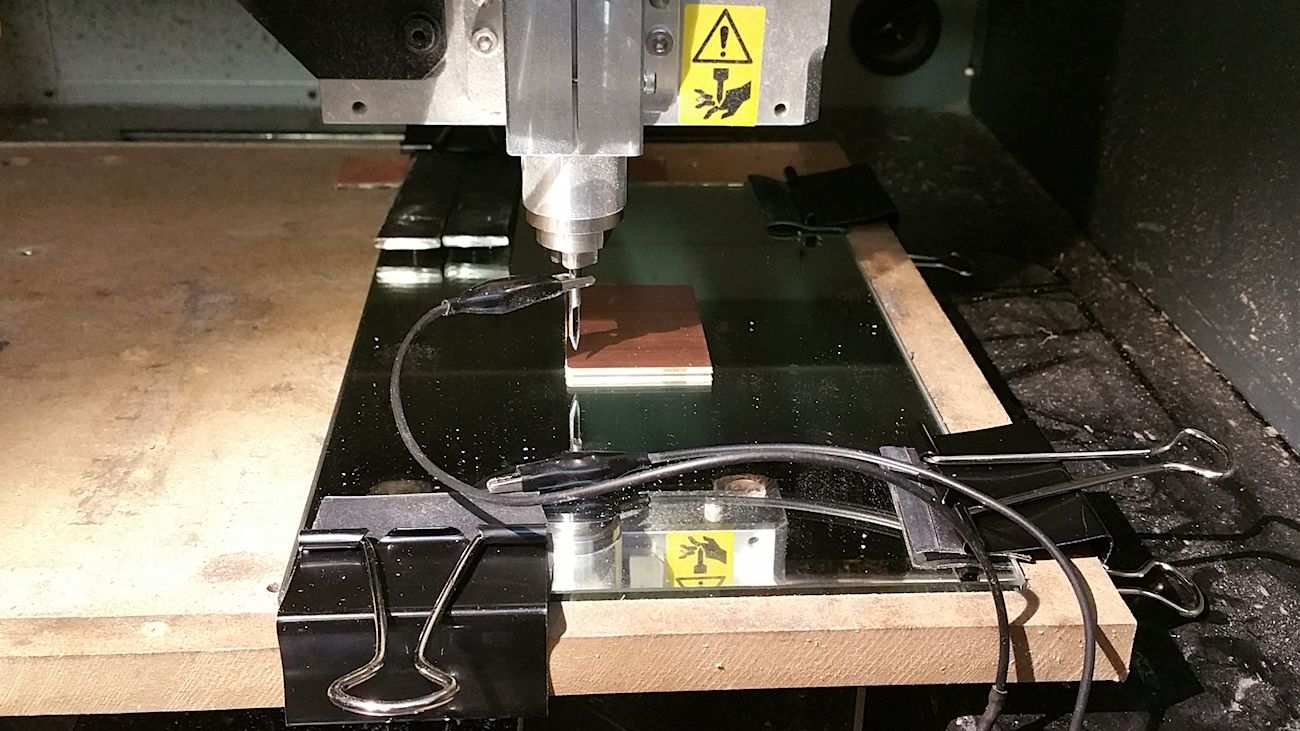 For my board I decided to use an alternative method to try to uniform the Z depth all over the surface. I bought a piece of mirror, and cut the board almost the size of the final result so that the error due to convex or concave surface would minimize. Then I used bi-adhesive tape to stick the board on the mirror. Finally I blocked the mirror on the mill plate with metal springs. In this way the error on the Z axis, along the board surface was about 0.02 mm.
