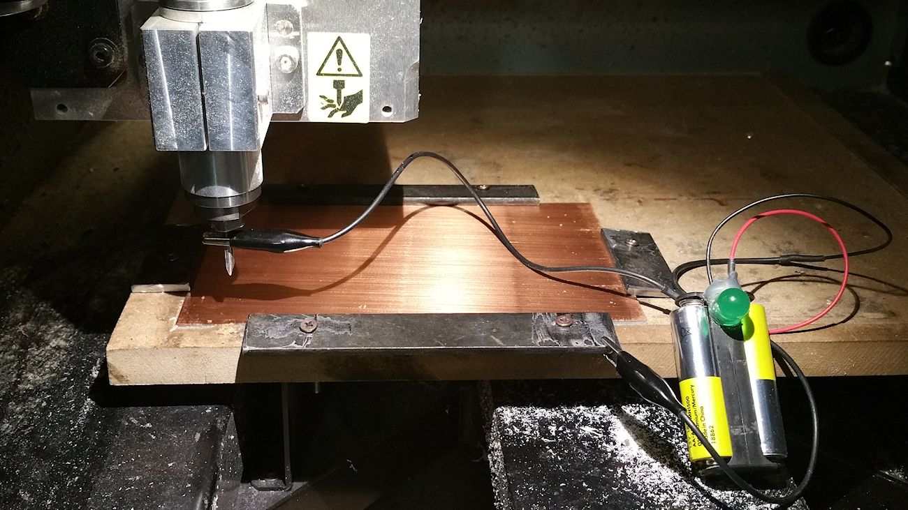 Having the board stuck in place, we calibrated the Z origin, using a "high technological solution" made out of a battery pack, a LED and a couple of crocodile tweezers, so that when the burin would have touched the board, the LED would light on ;) .