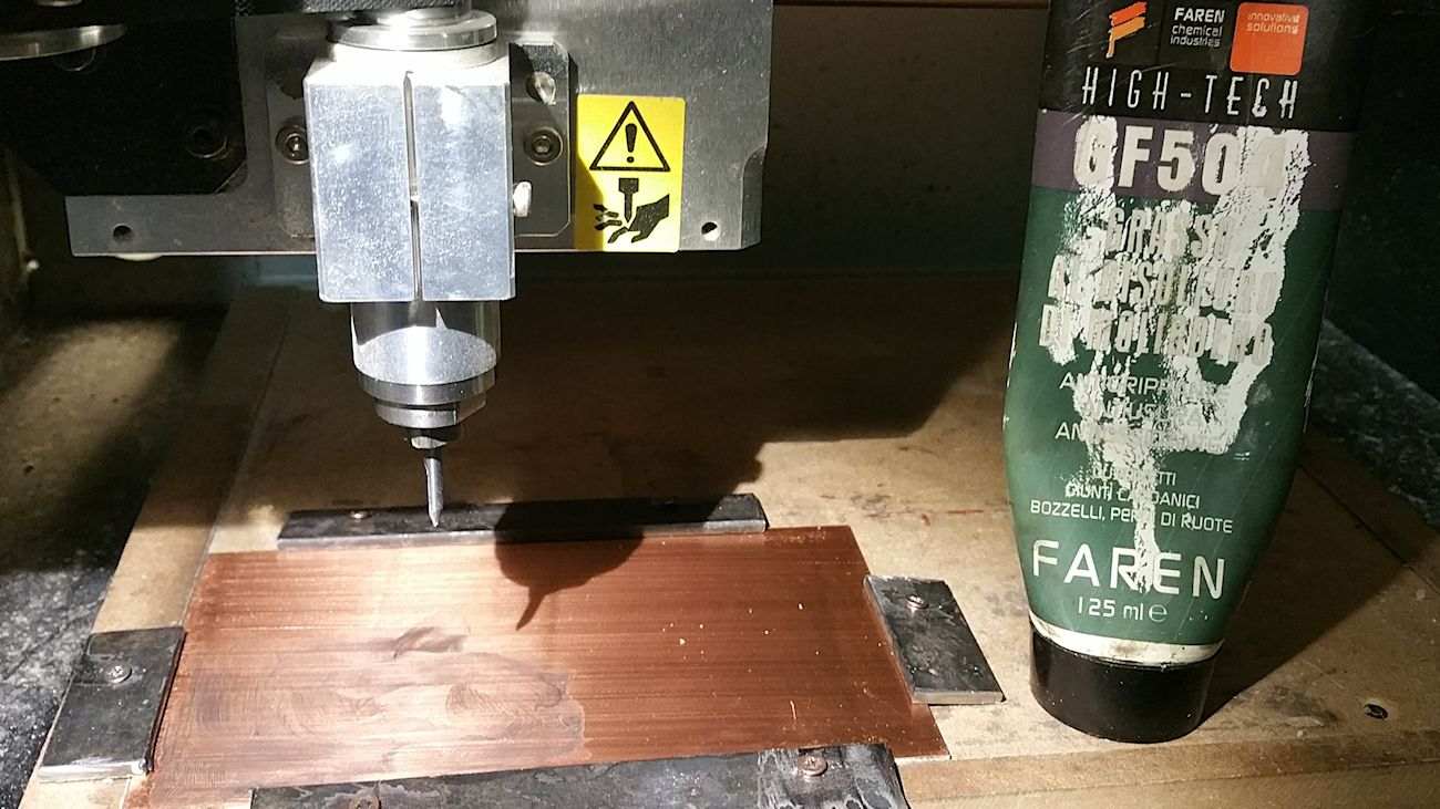 After fixing the problem with the feedrate parameter, it was time to actually produce the board! Folling Neil advice, we tried to use bi-adhesive tape to hold the board, but because the build plate of the CNC mill is made of MDF, the bond wasn't strong enough and the board edges weren't exactly horizontal. So we used some metal scrap screwed to the plate to hold the board in place.