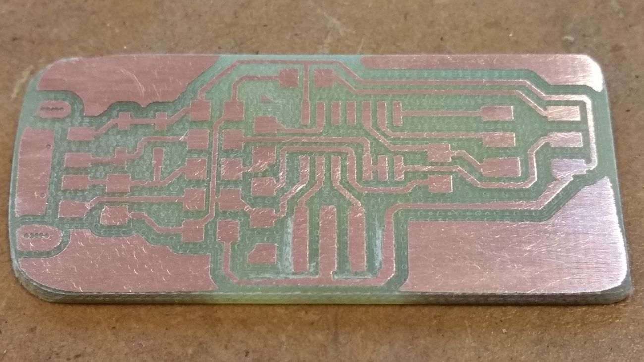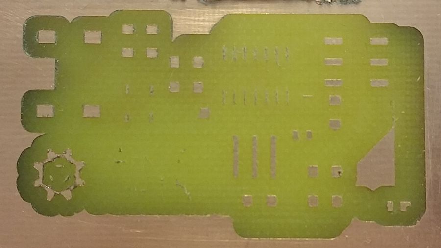 We corrected the value and recalibrated the machine. The second attempt was better, but because the board was not exactly horizontal, the Z level was not the same all over the surface of the board. That lead to a result where some part of the PCB was etched too much and others were not etched at all.