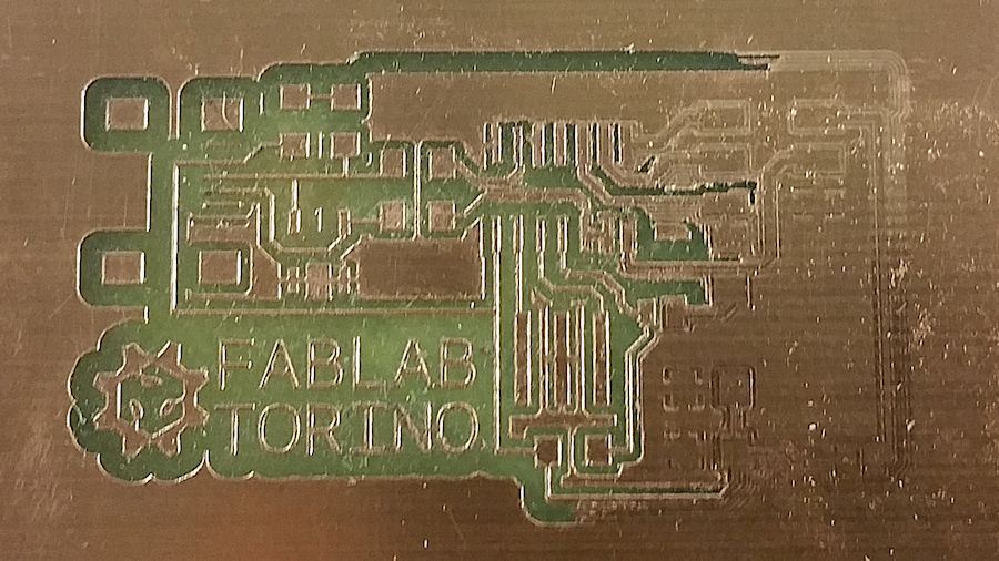 We waited for the mill to do its work, that took approximately 45 min. The result was really bad. The etching process had removed too mach copper, so that the traces were really really thin, or even non-existent. We investigated the causes and we found that we calculated a wrong dimension for the tool diameter, hence the generated g-code was expecting a different size for the burin head.