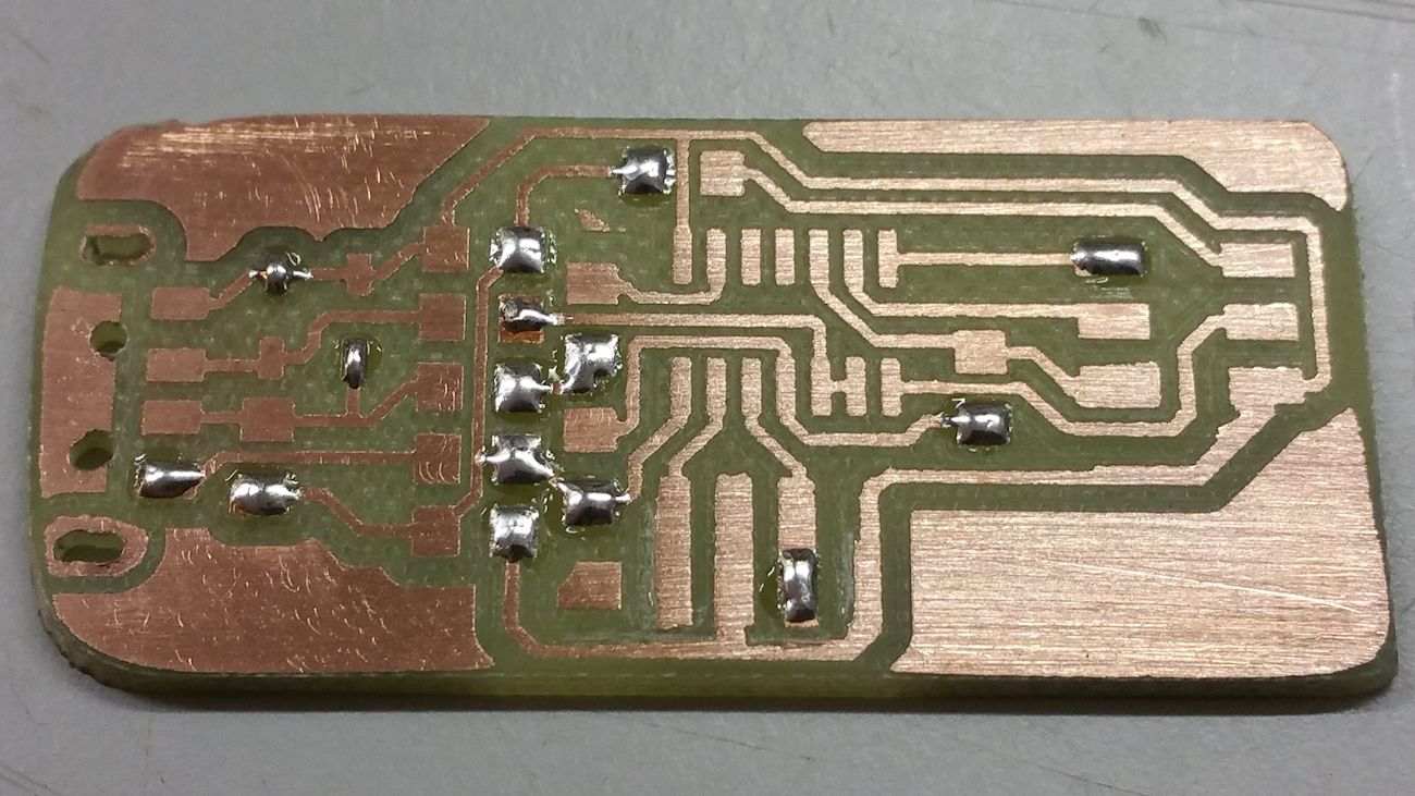 The Weller iron we have at the FabLab is really good, but maybe with a sharper point and a thinner solder wire, the result would have been better. Anyway the final PCB was good and I was happy with it.