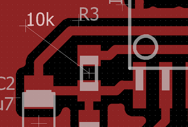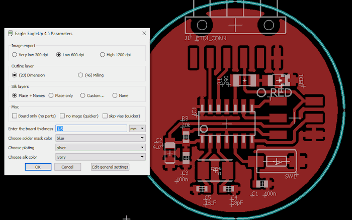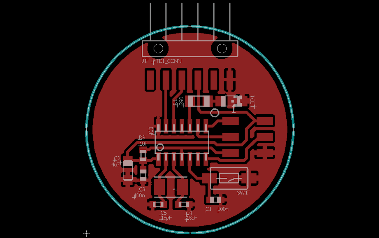 After a bit of grouping (command group), moving (command move), rotating (you can rotate components while moving them, by clicking the right mouse button) and trying (with commands route and ripup), I came up with a board layout that pleased me. As a final touch, I added a ground plane, and modified the outline dimension to be circular.