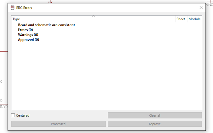 I finally did a Design Rule Check, and to make the layout more readable I rearranged the names and the values of components in a more tidy manner.
