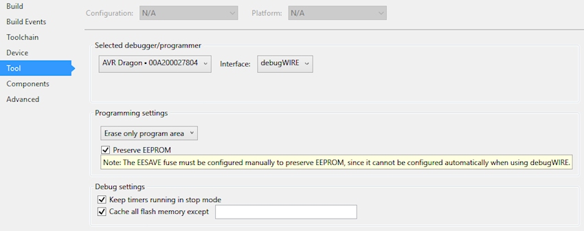 Moreover I decided to tidy up the code I wrote last time, and to organize it in subfolders. The result was a well structured file tree. In order to debug the ATTiny, we have to use the debugWIRE interface, selecting it in the project properties and writing the fuse bit DWEN.