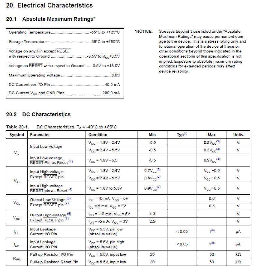 The next section I usually read really carefully is the Electrical Characteristics (sect. 20) one. In there are listed all the Absolute Maximum Ratings and the DC levels used. From these tables you can determine things like the maximum operating voltage (so not to burn the microcontroller, supplying a wrong voltage), and the DC current per pin, so to size the load on it correctly.