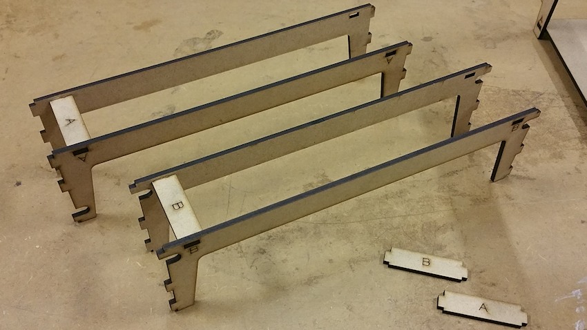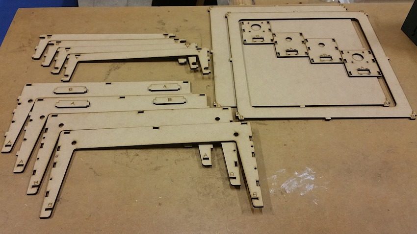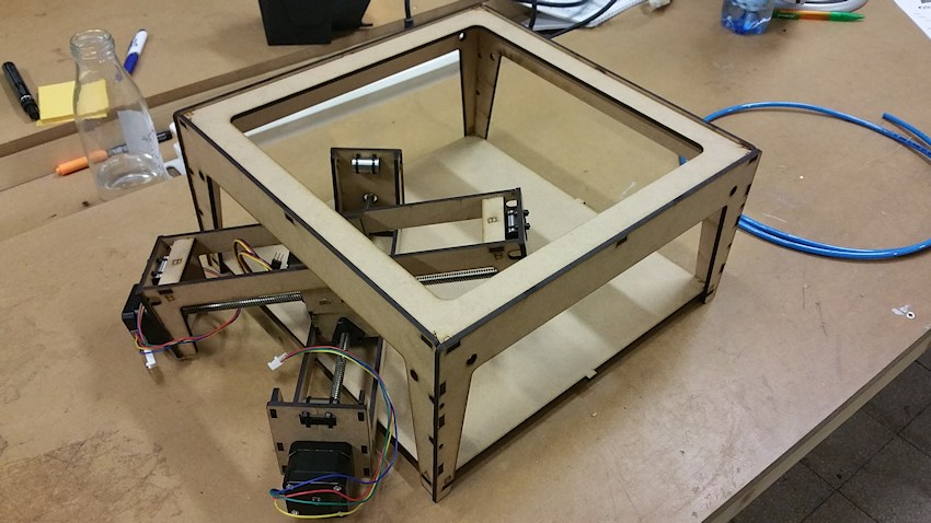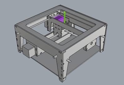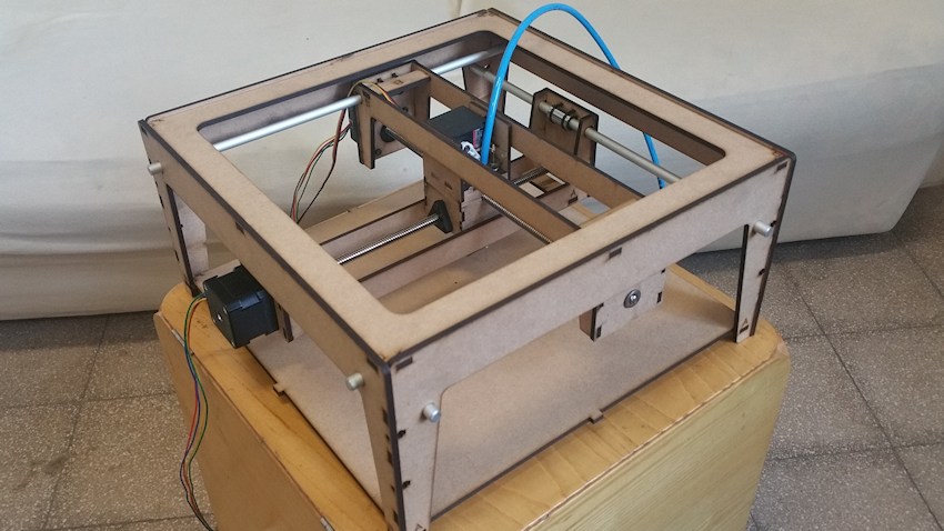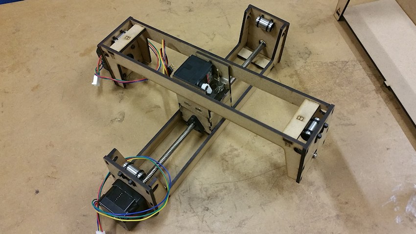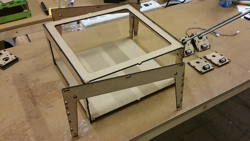 To make the machine more solid and reliable, we designed a frame that can be laser cut from a sheet of 4mm MDF, and mounted without glue or screws just by press-and-fit. The result was a sturdy square frame, with holes to keep in place the linear rails, and with openings on all sides to make easy the assembly of the whole structure.