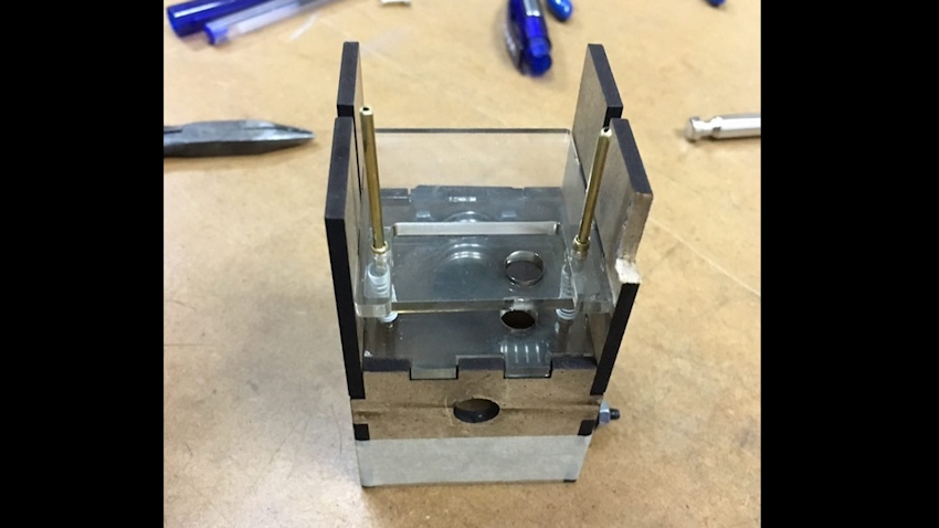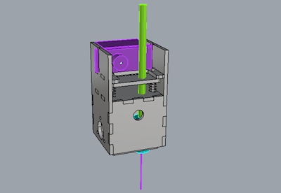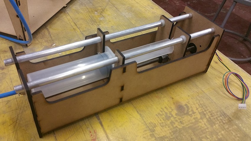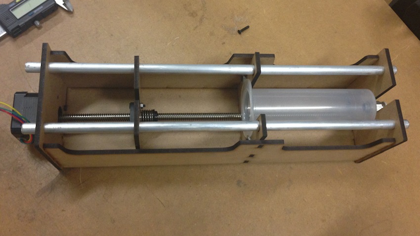 After a bit of tinkering with linear guides and bushes we designed a simple box in which is possible to easely put on and remove the syringe.