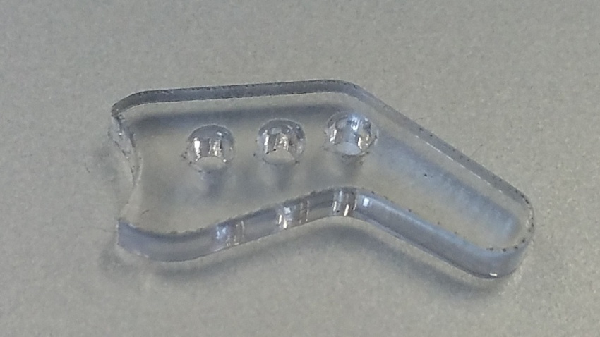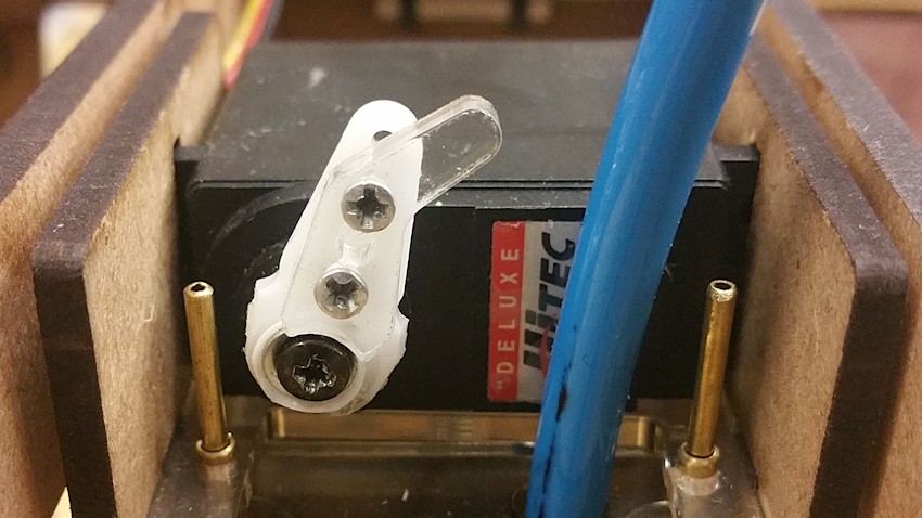 Moreover, to make the movement of the servo arm more centered compared to the plane that pushes the needle, we designed and laser cut a small plexiglass arm to screw on the original one.