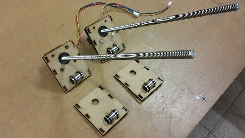 Since we had to use the motors included in the kit, that are motorized lead screw steppers, we decided to build an X/Y gantry system, taking cue from the Ultimaker Original 3D printer. In this kind of system, the extruder (or in our case the actuator) is placed in the intersection of the lead screws and moves along the X/Y directions, thanks to the force applied by the motors to it.