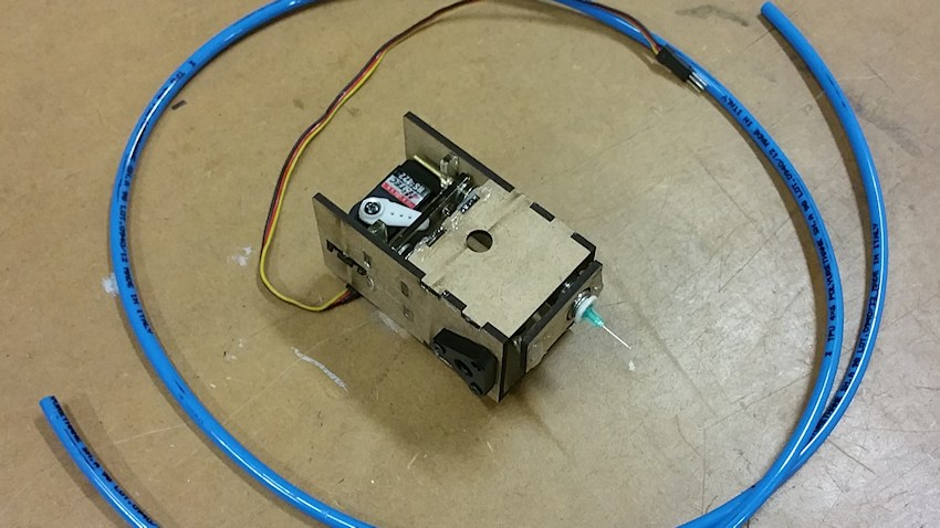 So we racked our brains and we came up with a more compact design based on the use of a servo motor to push down a structure holding the needle, and on the use of springs to make the structure go up.