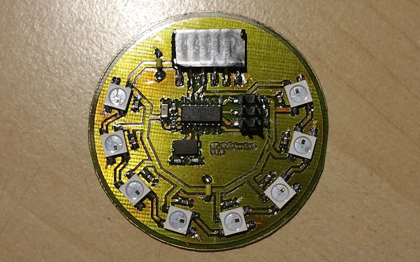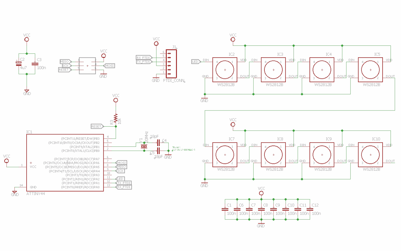 So the first step was to create a circuit schematic and board layout to use some of these. After a little bit of work on Eagle, I came up with a simple board with the ATTiny44 and 8 WS2812B leds.