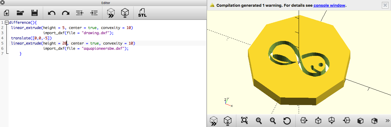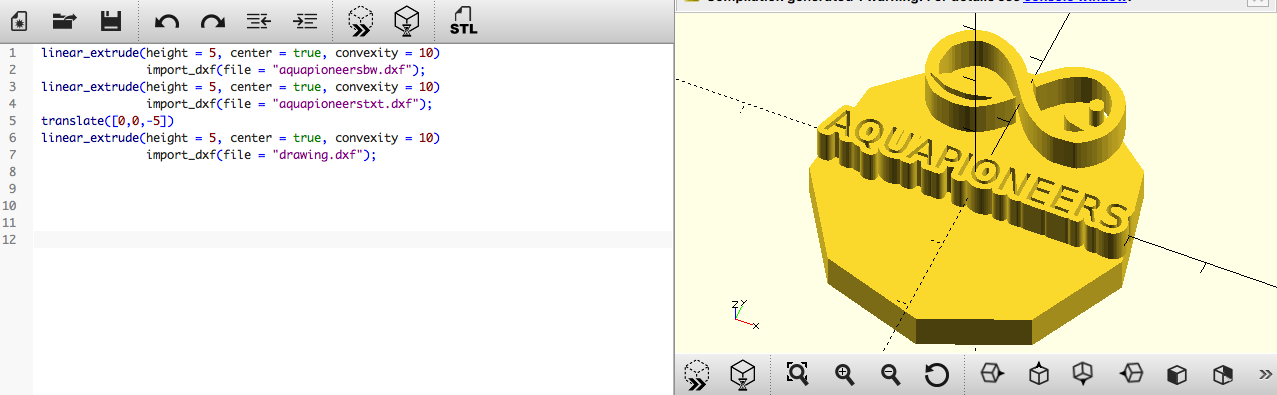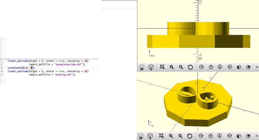 Now let's add a new object (a polygon) and place it underneath Aquapioneers' log. For that follow the previous process with a new file on Inkscape and open it in OpenSCAD. In the help we search for translate, on the point 3. An then copy the following line between the two lines