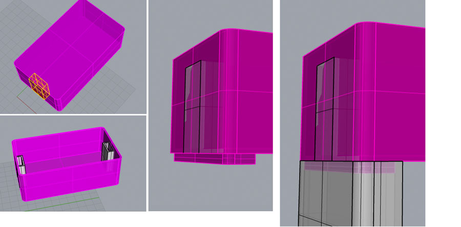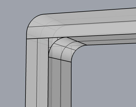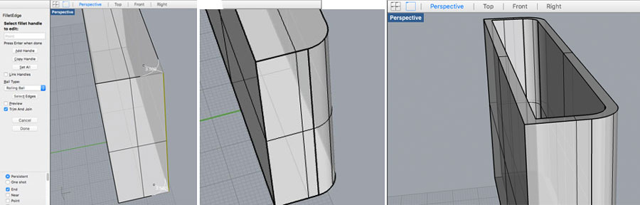 Commands used: (1)"Filet Edge" creates a tangent surface between polysurface edges with varying radius values then trims and joins the original faces to the fillet surfaces. Followed by a "Shell".