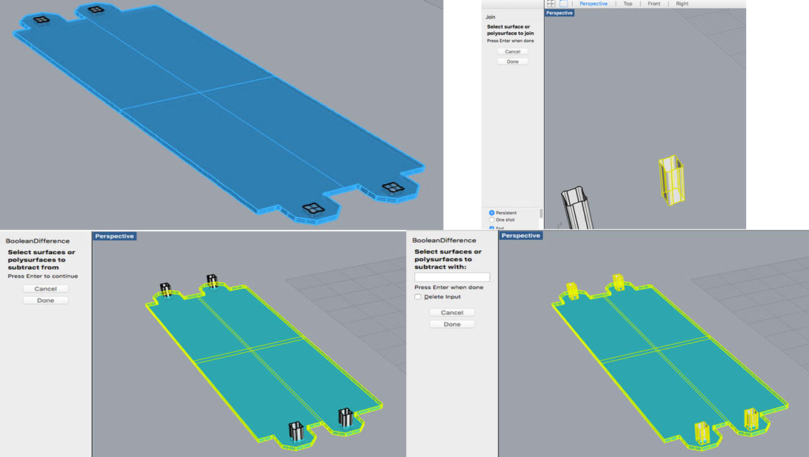 Command used: "Polyline", "Cap" (to turn closed polysurface into a solid), "ExtrudeCrV", "Join", BooleanDiff", etc