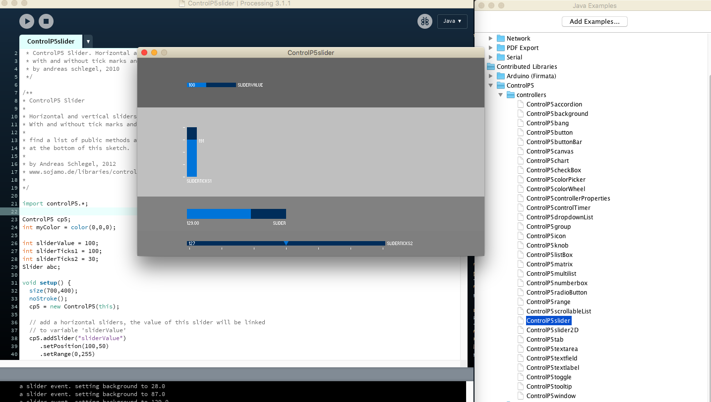 For this week Saverio showed us a library, written by Andreas Schlegel, ControlLP5. It is a processing and java library for creating simple control GUIs, that is easy to use. Since I heard that Processing was easy to learn for designers and artists and that I saw projects online such as these ones below and I decided to choose this Programing environment to do my Interface Application Programing assignment. Below is an exemple of controlP5 slider.