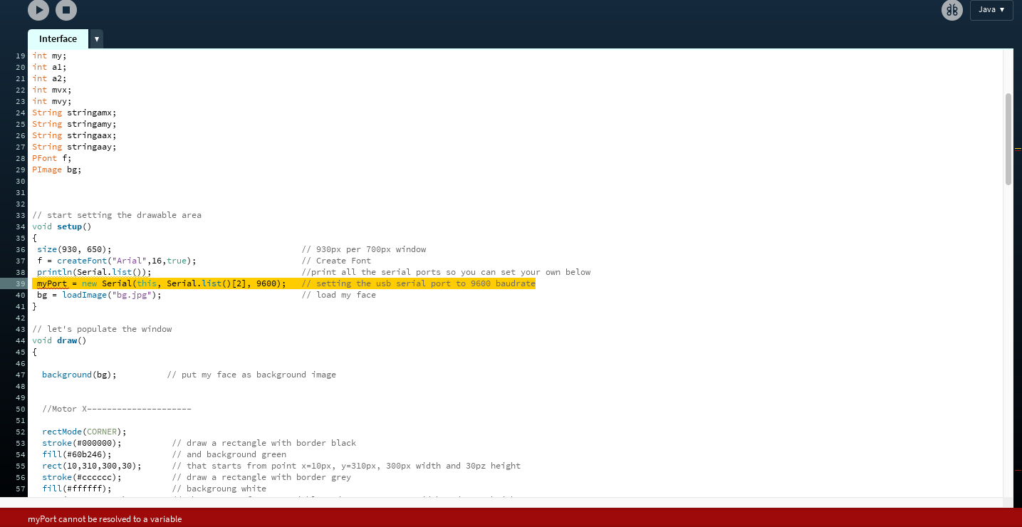 The Processing file, at first, I was unable to test drive it. Processing verboase alway gave me this error code while when I press "Play" to run the sketch and show the interface.