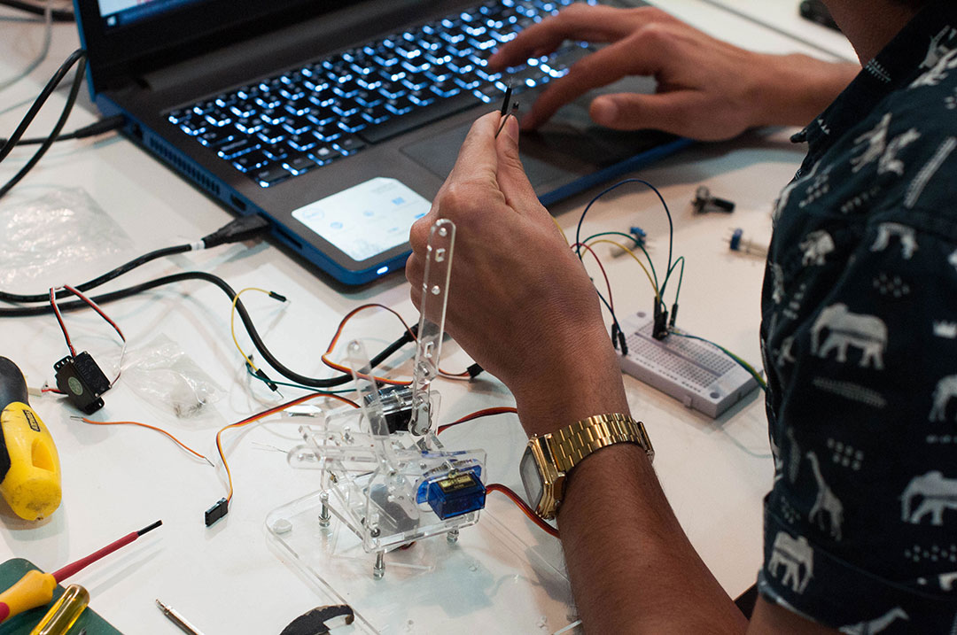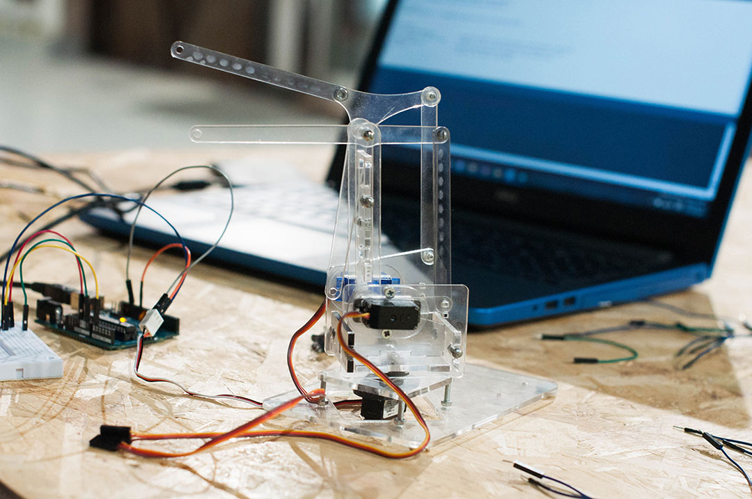 We looked at a lot of different robot arms and decided to build one that is similar to the MeArm tiny 4-axis robot.