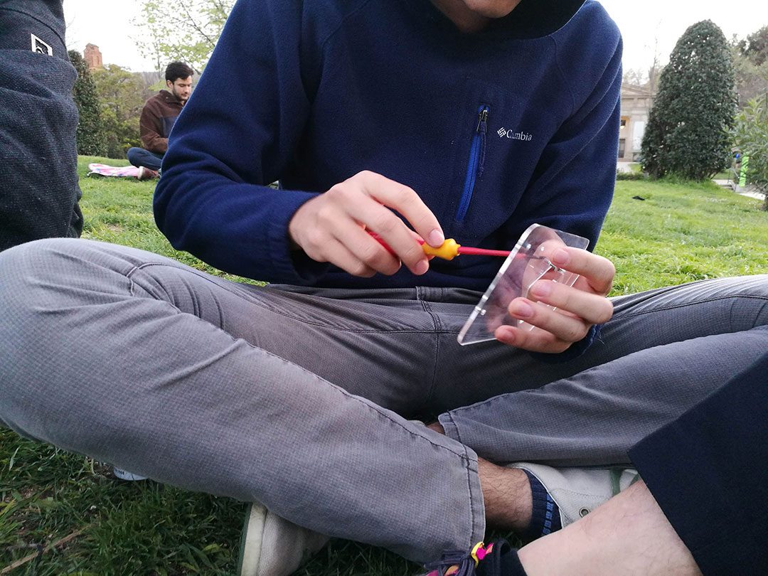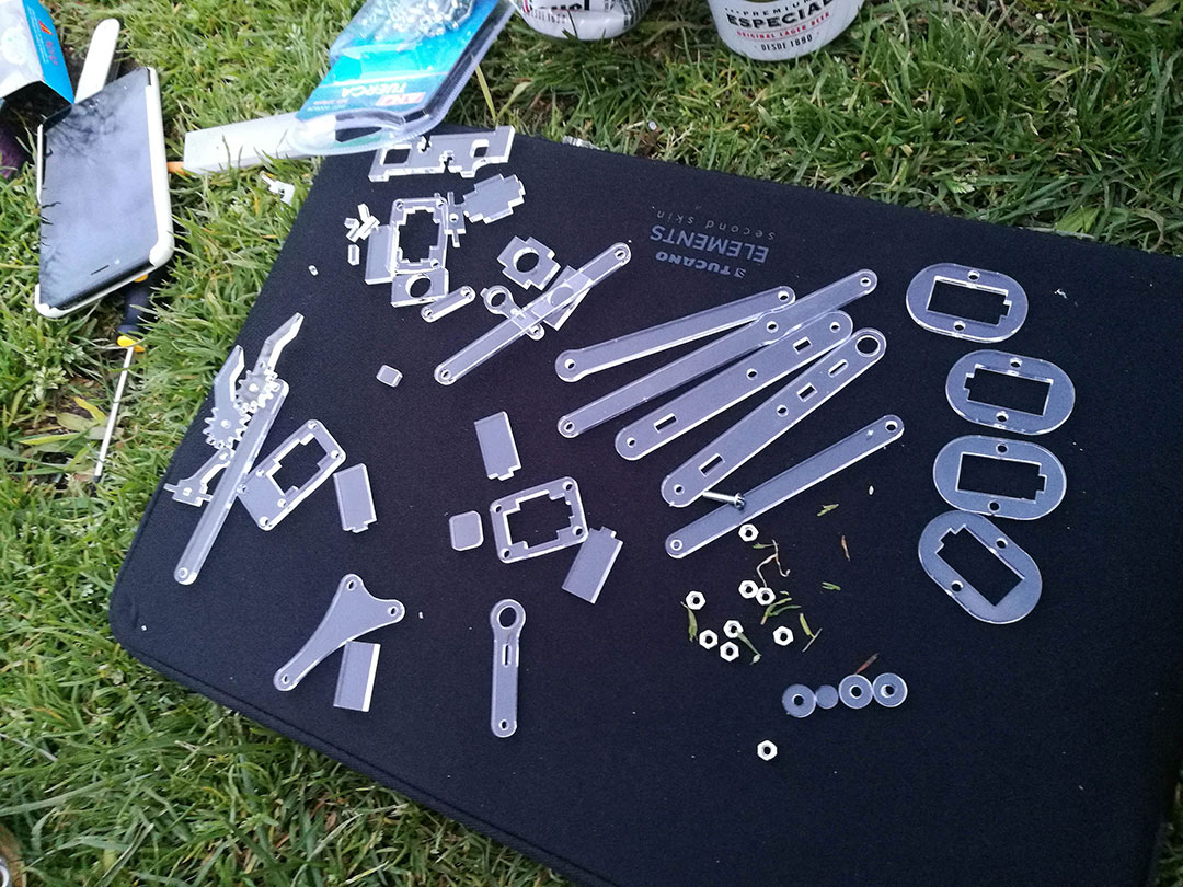It was Saturday so the fablab was closed. We decided to go to the FabCafe, a place where you have to see when your visiting barcelona. They have a 3D printer and a lasercutter and for a small amount of coins we let our parts cut out of 3mm acrylic glas. After that we meet in the park and wanted to assemble the robot, but found out we would need the servos to assemble it. At least we found most of the screws we need in a hard ware shop.