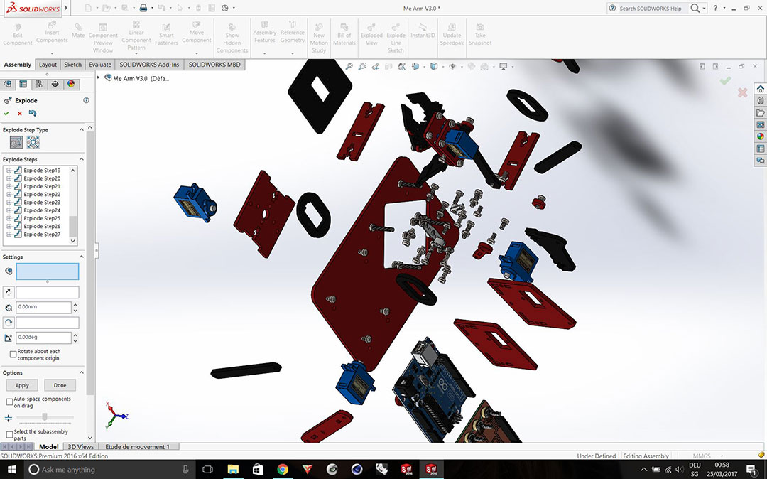 We started disamble the 3D file in solidworks, but found out later that it would be easier to open it in rhino make2D and lay all the parts on the stock for the lasercutter. The thing about the file was that it already had all the simulation for the movements in solidworks. That comes in handy for the future when we want to create our own arm.