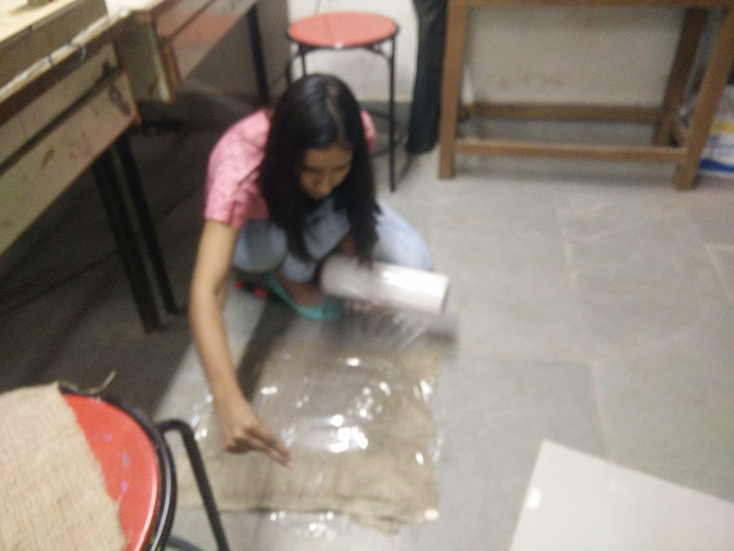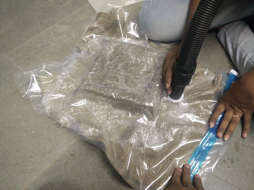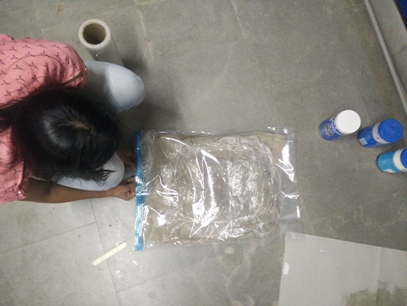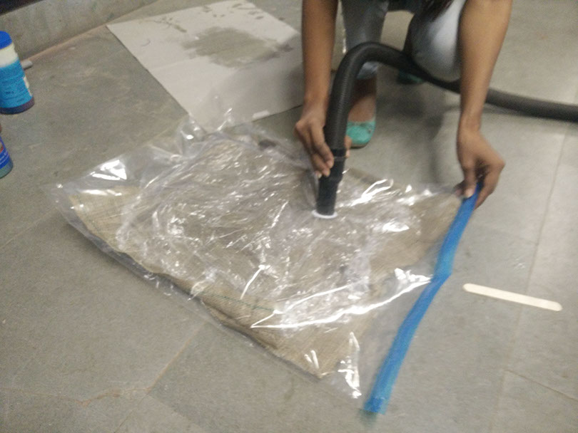 4. The CNC mold with burlap is passed into a Vaccum bag. The zip is secured tight and then air is sucked out using a Vaccum-cleaner. It is left overnight to harden.