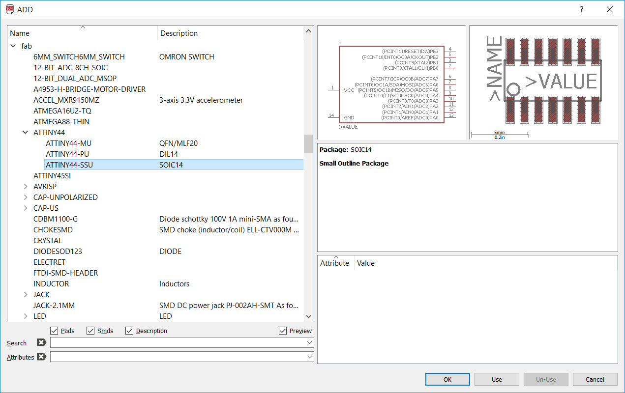 First I downloaded the schematic available in the Fab Academy website to see the basic before I start my own board. It helped me to identify the components. From the same page I downoaded the Fab Library for Eagle and placed in the C:\EAGLE 8.0.1\lbr folder.