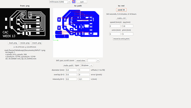 Below, are a few images that show the parameters I used for milling the board and the process of milling: