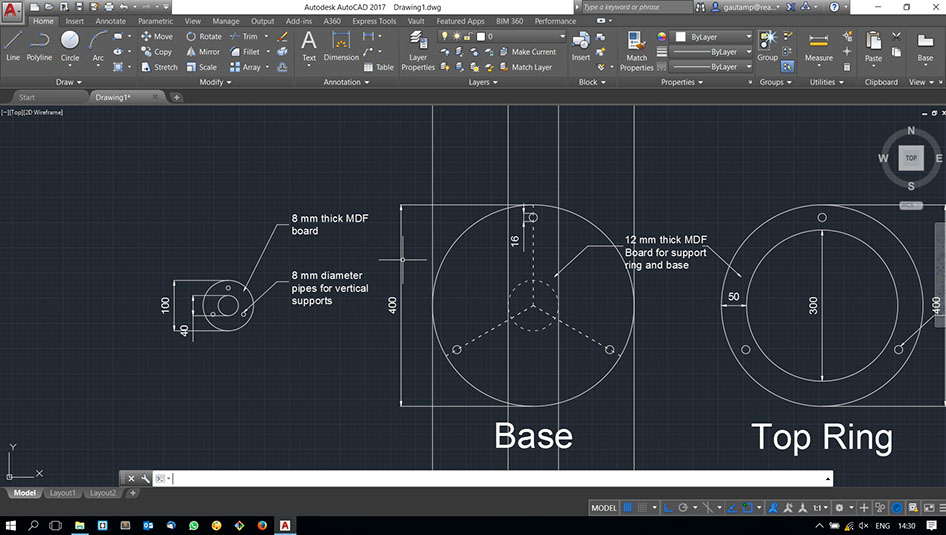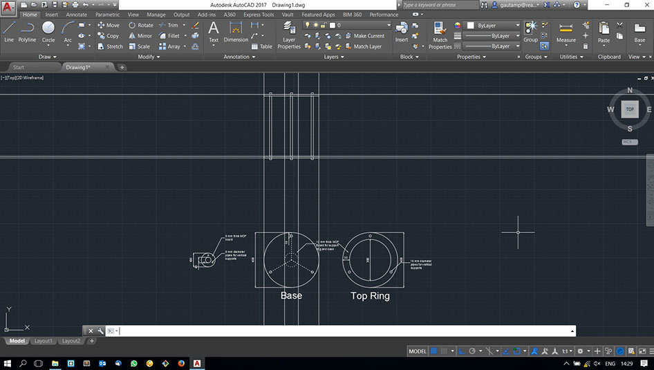 I started with drafting of the base plate and the top ring required for the printer. Hence made a Circle of the required diameter and offseted it again for the top ring. Commands used: Circle, Offset.
