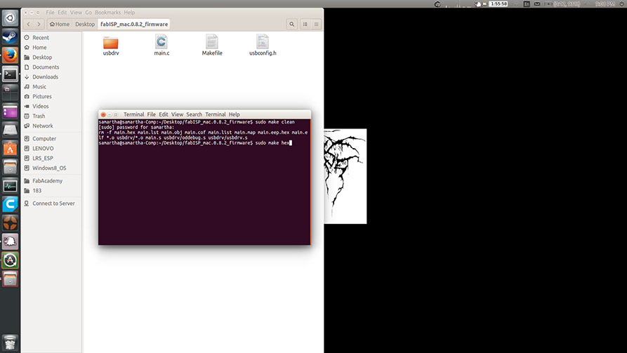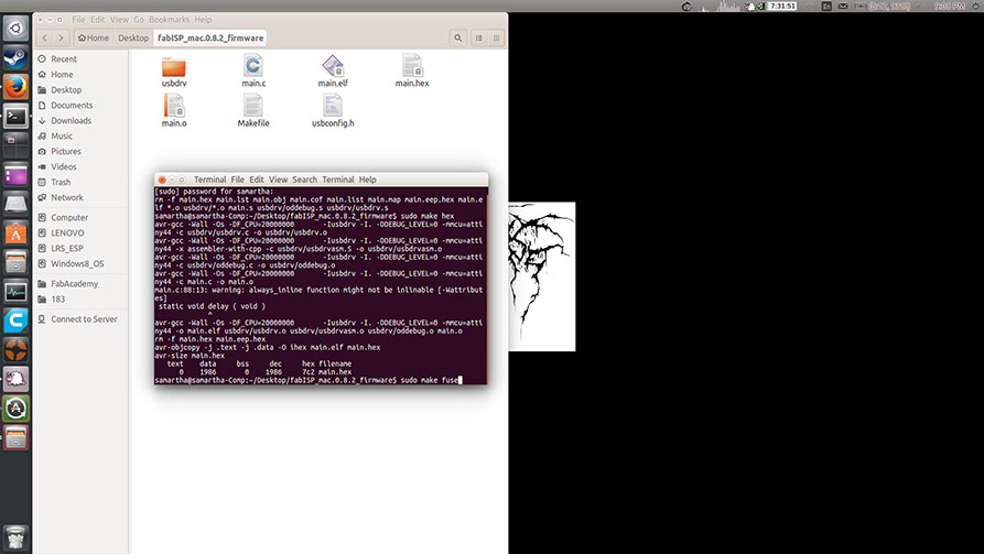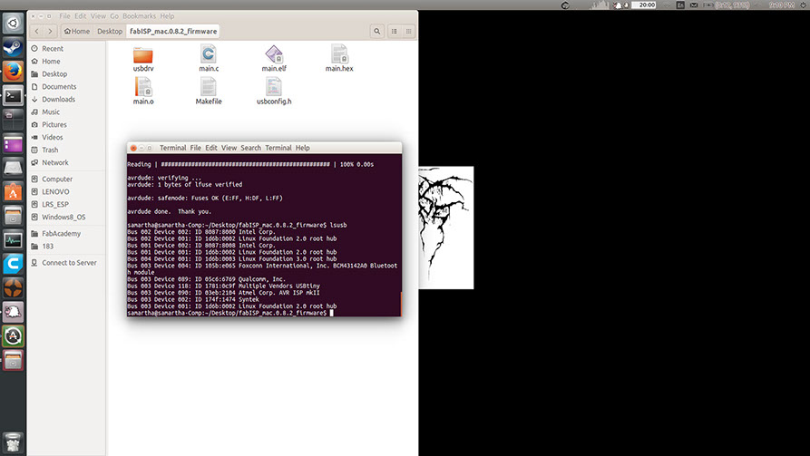 I connected the board to the AVR and to the linux pc to program the FabISP. Next I followed the steps mentioned in the link above to program the FabISP.