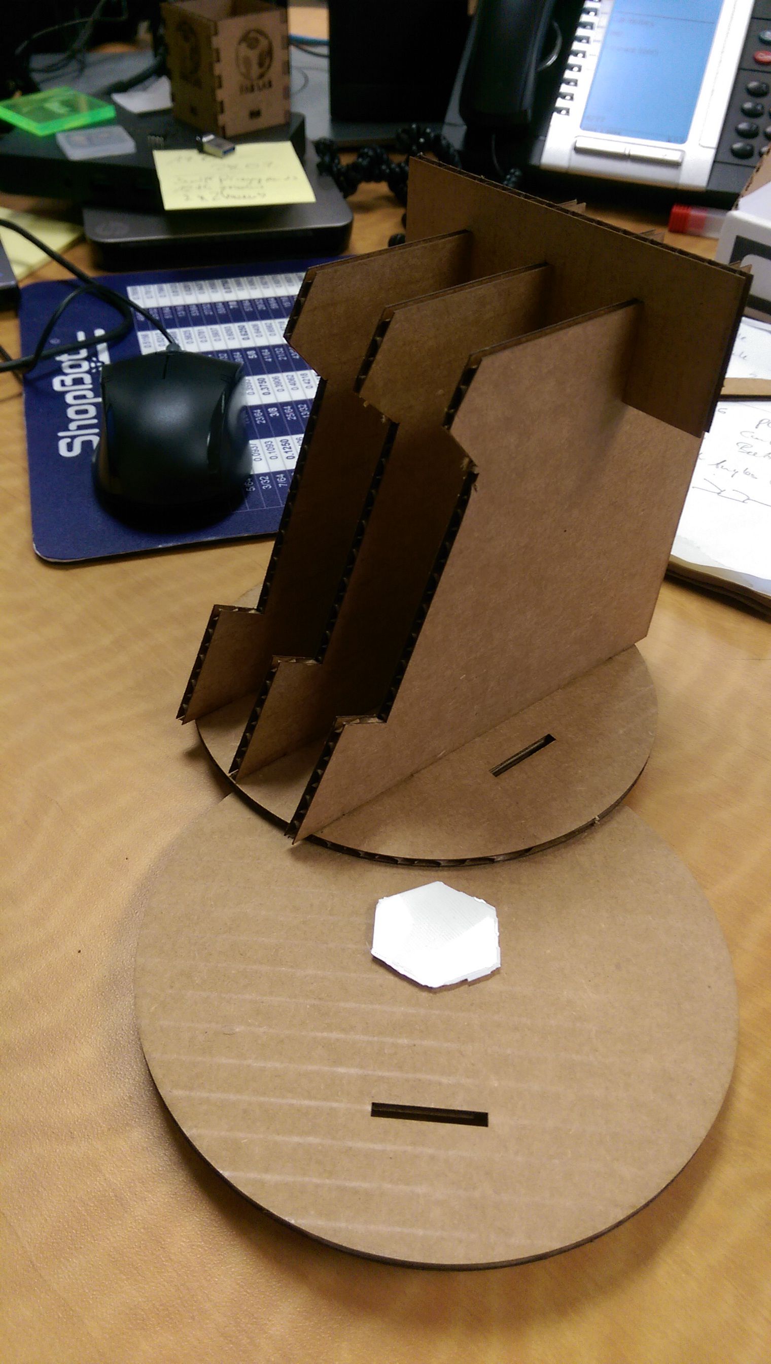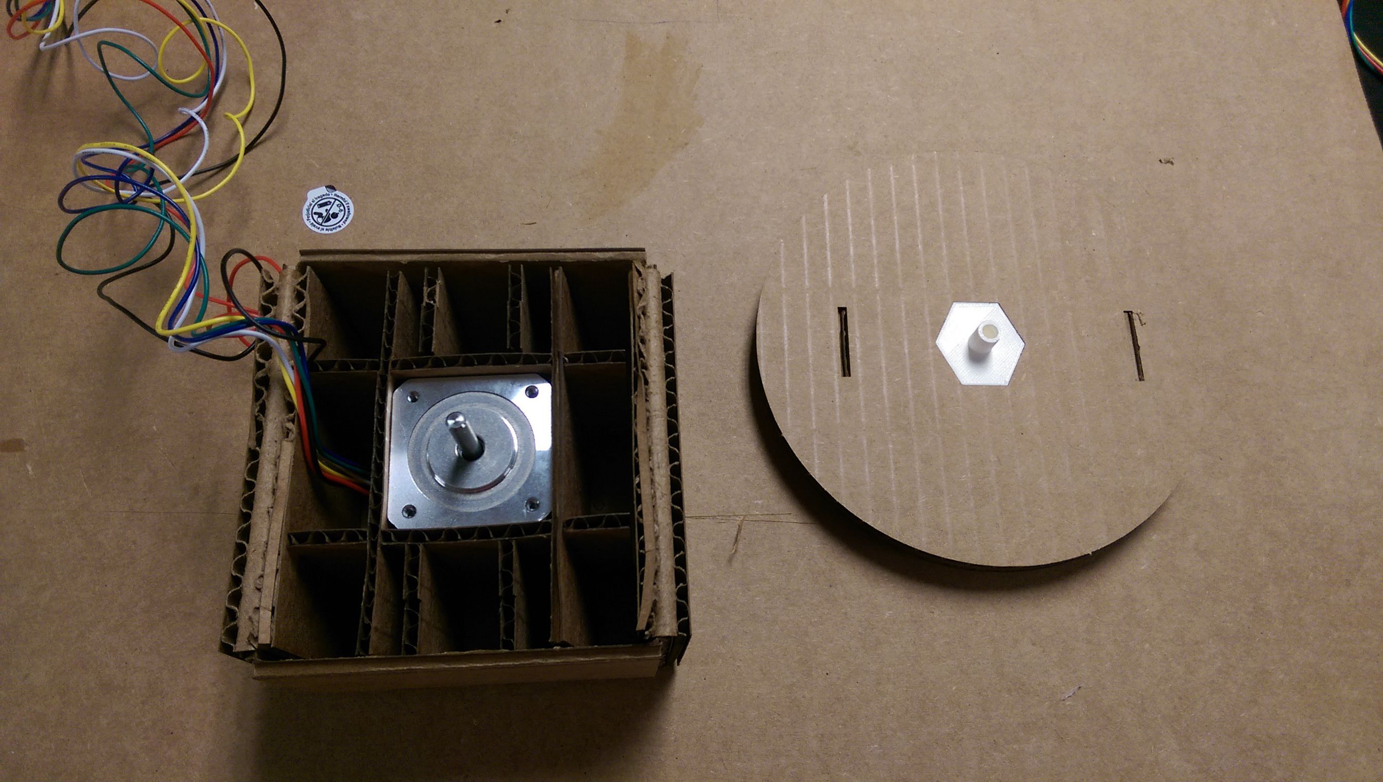 For the actual rotation platform, I designed two cardboard sheets and a 3D printed mount, to plug them on the motor shaft.