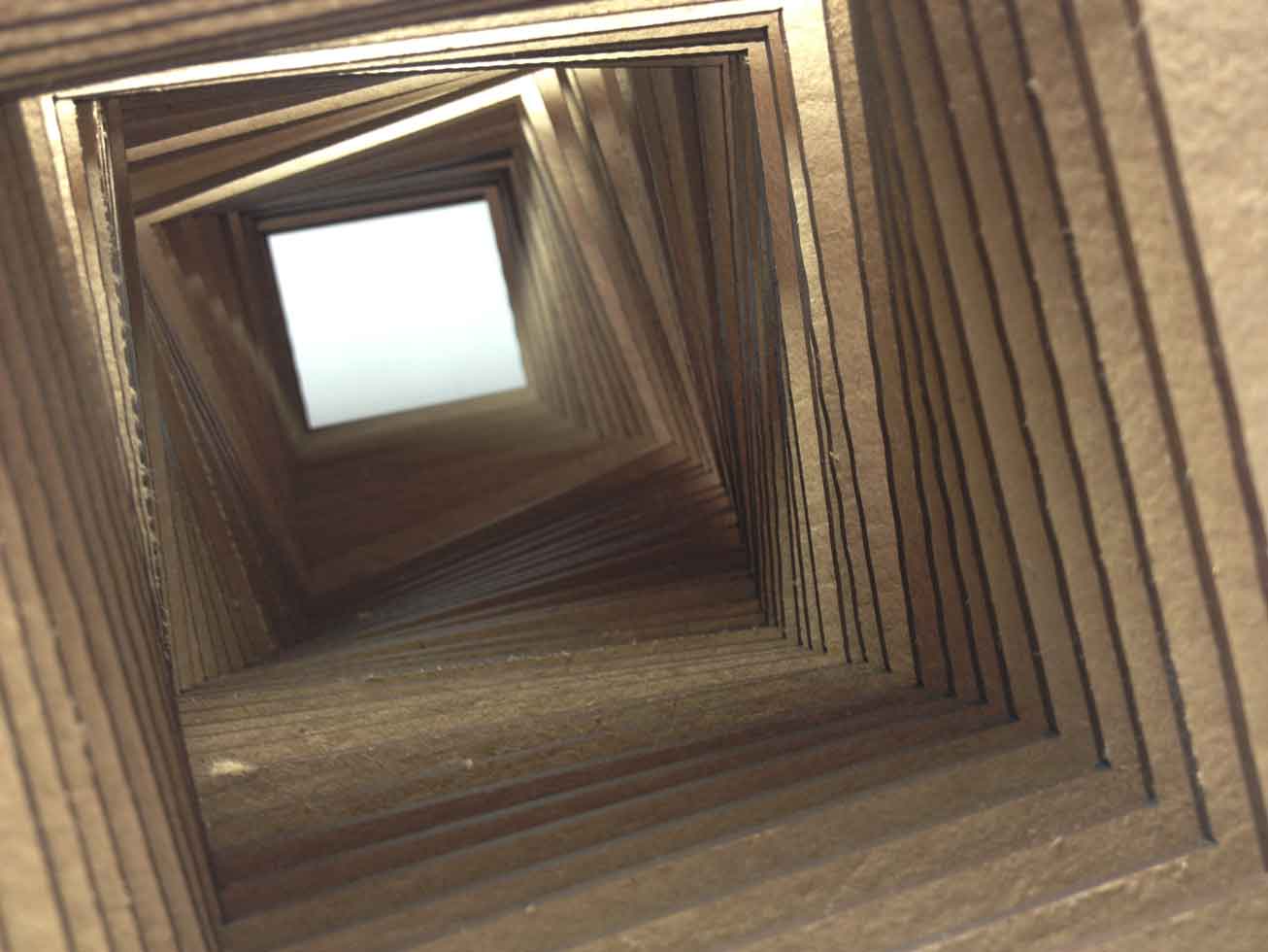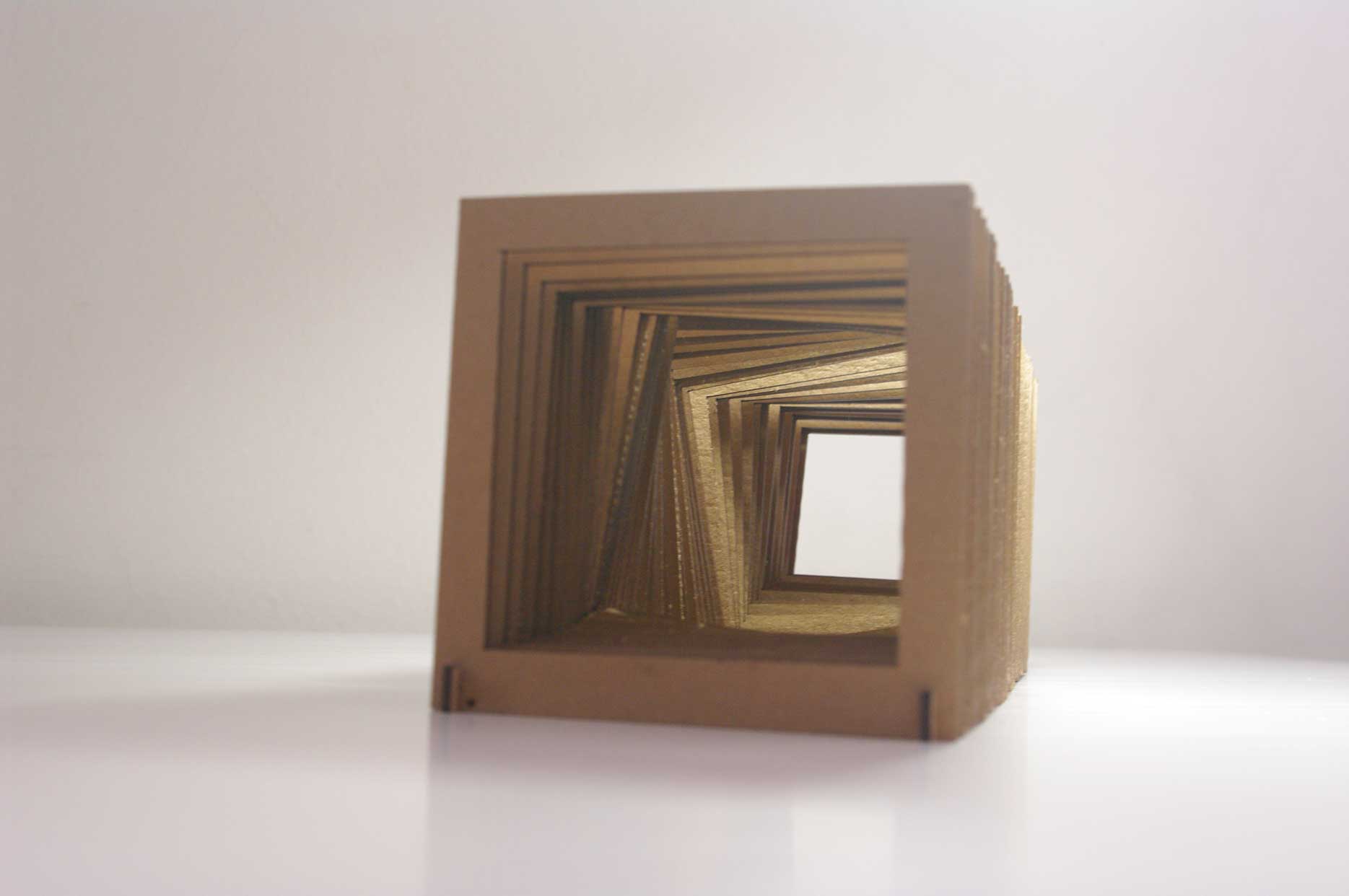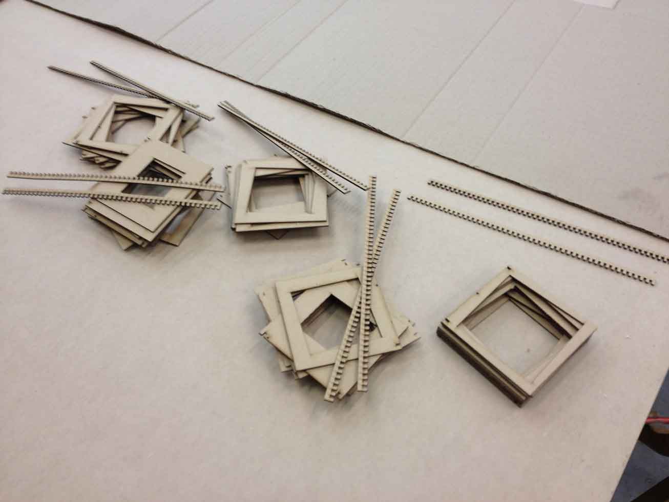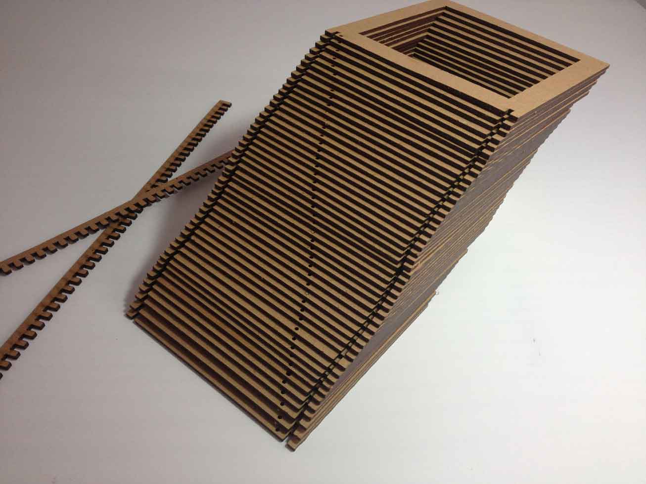 I made 48 layers of squares that would press-fit on a base keeping the set aligned and straight. The motion would happen inside this set of squares like a moving object had created a shape out of its interior.
