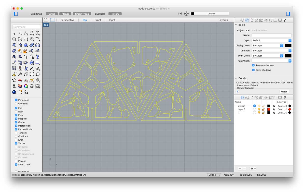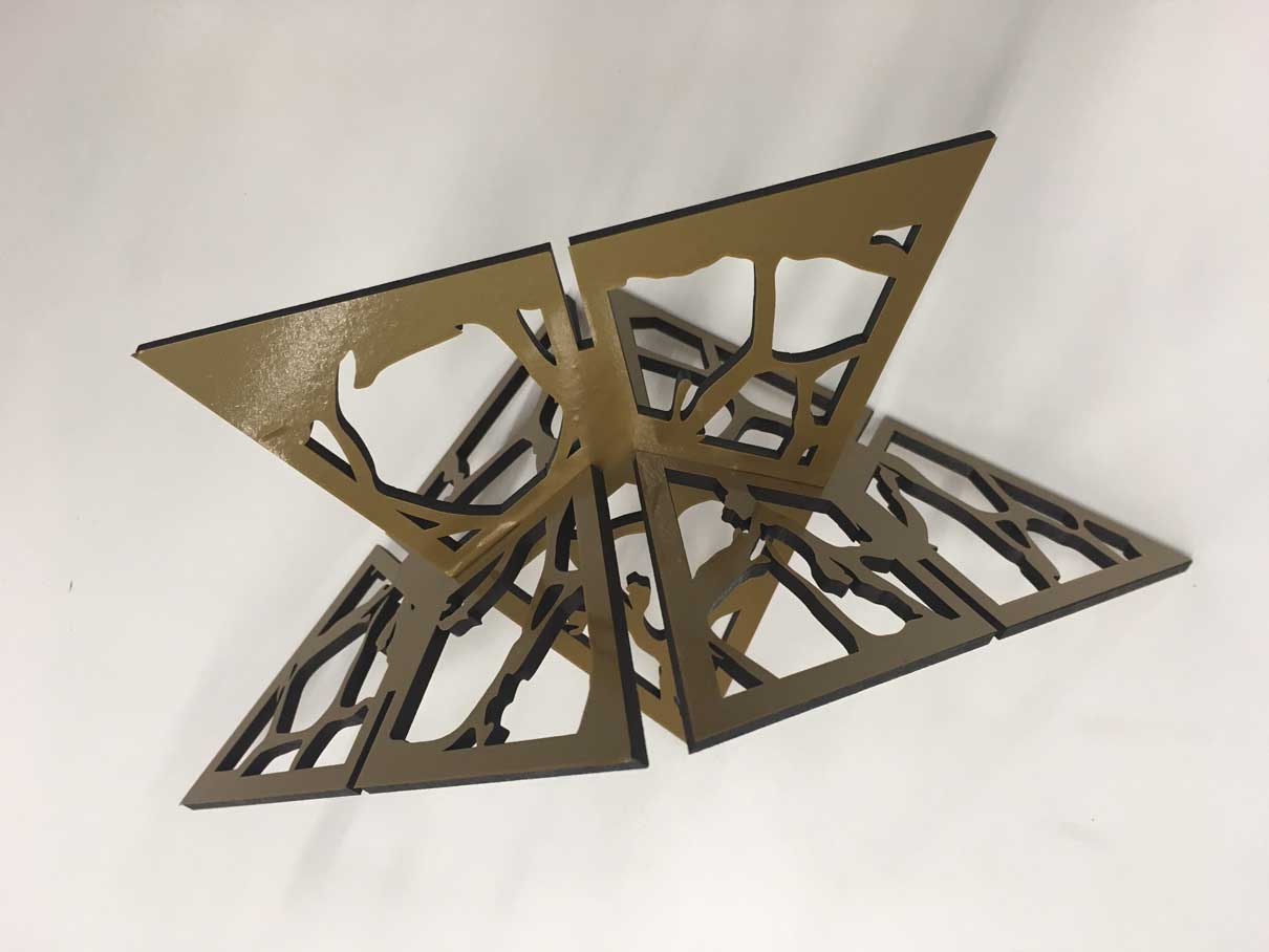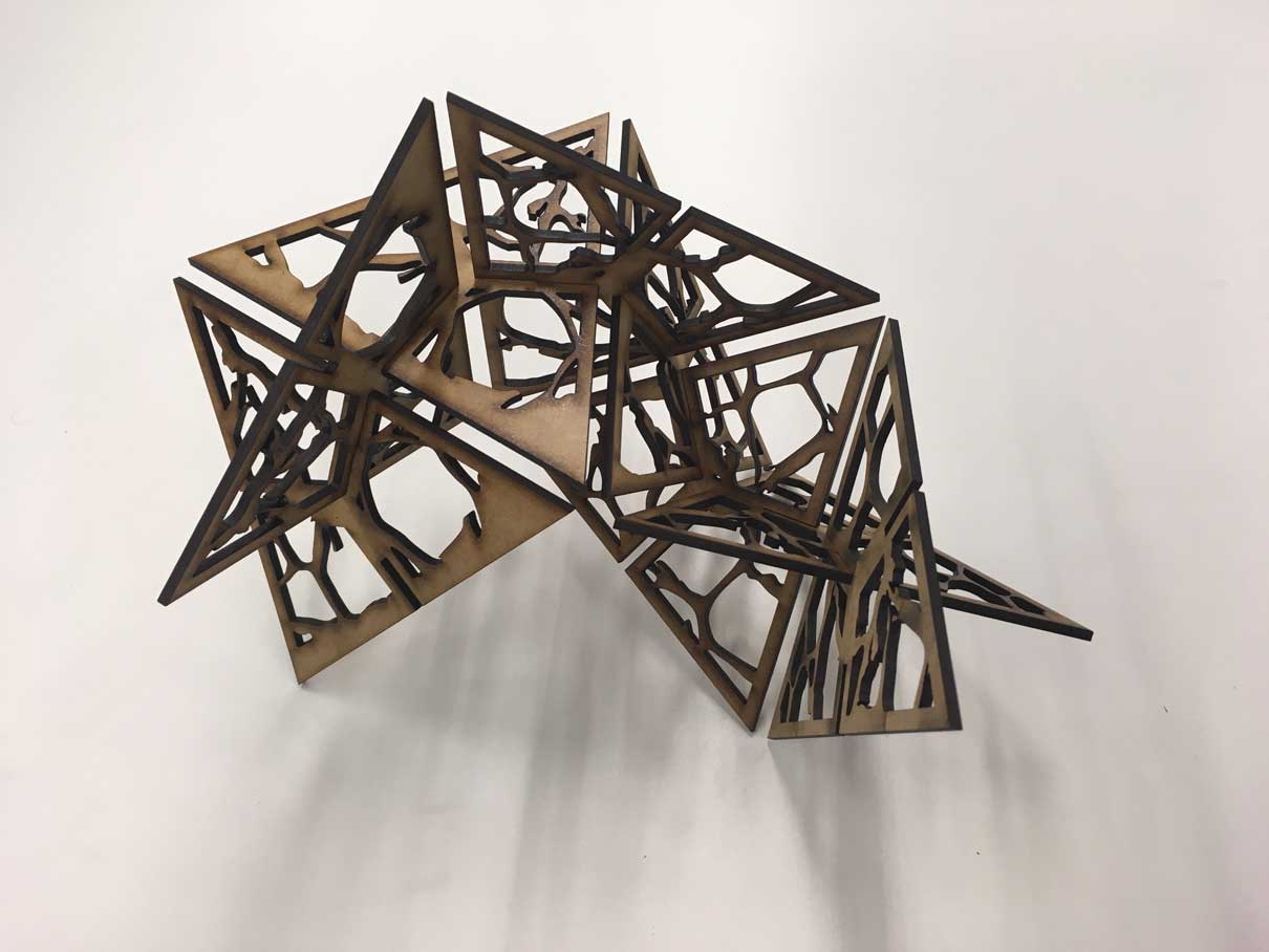 For this group assignment the idea was to work in a modular shape based on an equilateral triangle. Each triangle have 3 slots placed in each side in order to enable the adjustment between its parts. The final configuration of the modules would result in a sculpture.