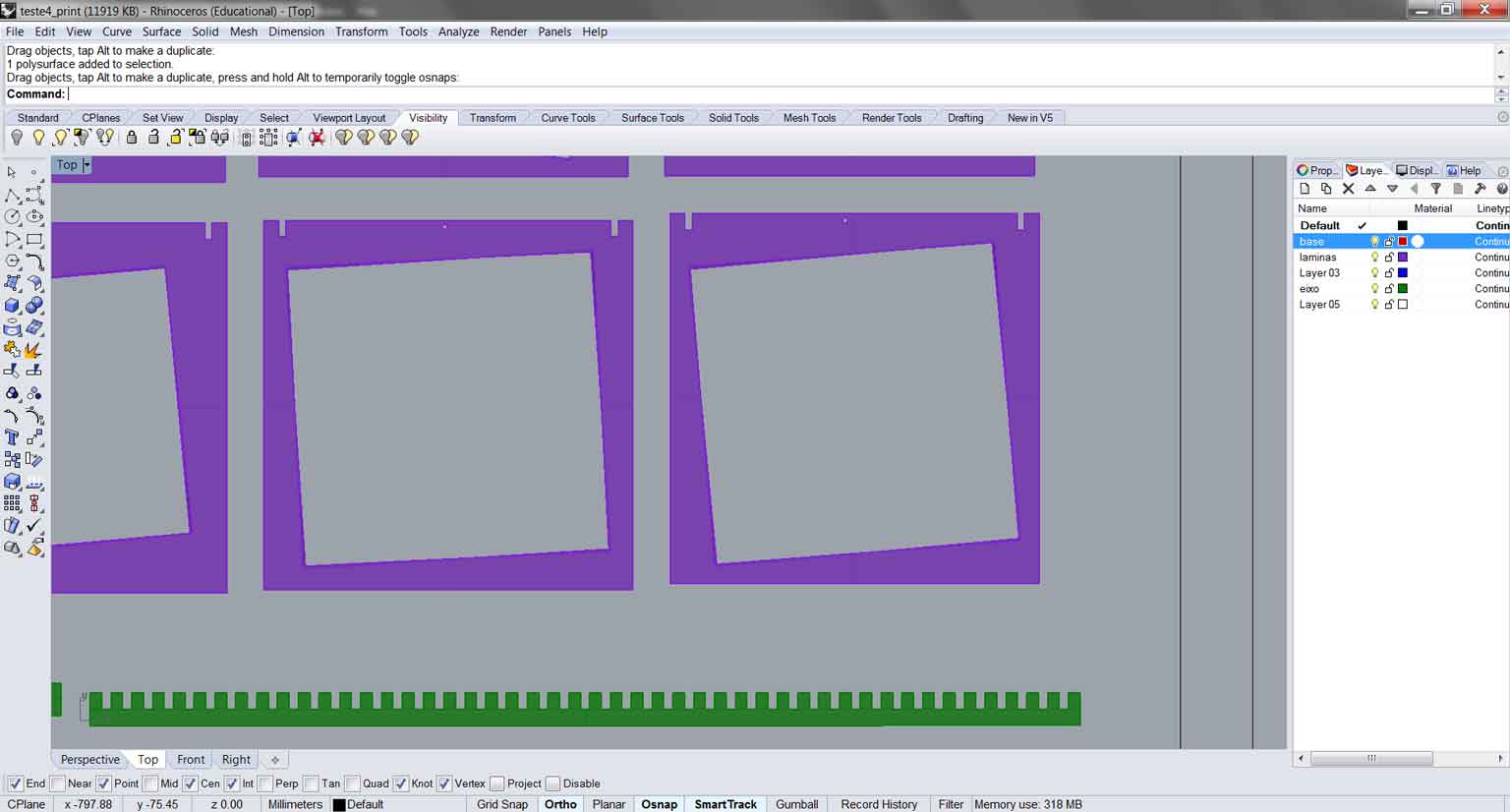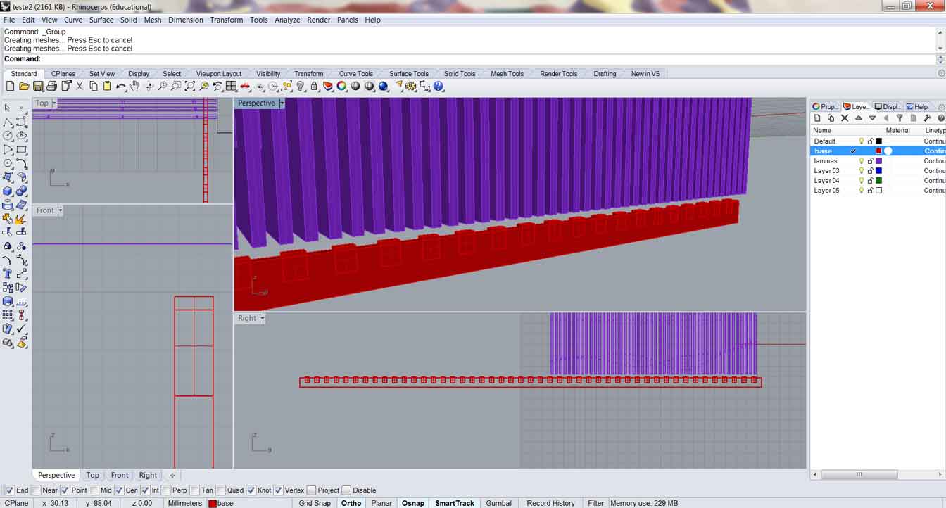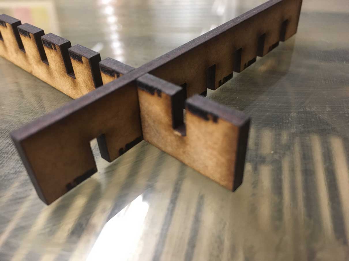 Using Rhino 3D we created a rectangle with several slots being the one in the middle the thickness of the MDF (3mm). We place three more slots in the right side and three more in the left side of this ideal slot. Those additional slots varied in width 1mm each.