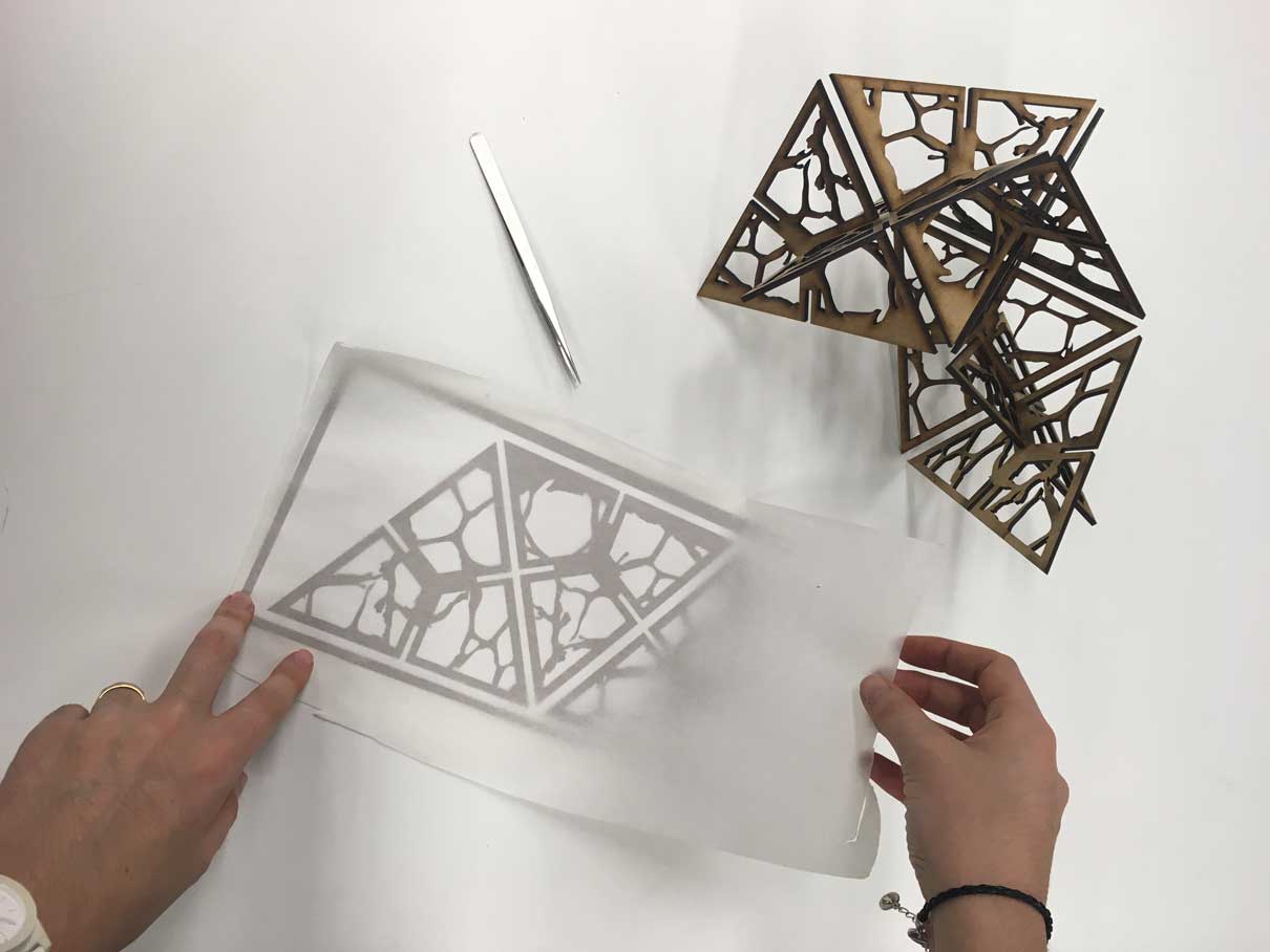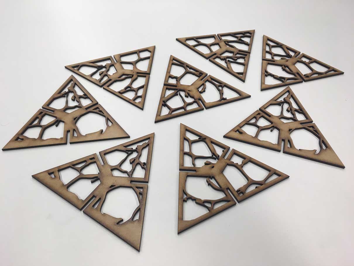 After knowing what was the ideal width of the slots (2,8mm) I designed the modules. The module were based on an equilateral triangle and its internal shape was organic and based on microscope images of cells. Three different modules were drawn using Adobe Illustrator and Rhino 3D and are inspired in the design of cells photographed by microscope.