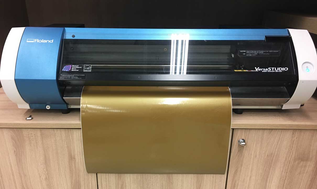Now comes the usual steps to cut any vector in a vinylcutter. First thing is to insert the golden vinyl colour that I chose into the vinylcutter. Using the software Roland Versa Works, I imported the .EPS file and checked if the file was recognizable. Usually there may be problems if I forget to change the stroke colour or if there are some hidden elements in the file. If everything is right I should be able so see the extension of the vector dotted and blinking. This is the moment to check if the design is in the right scale and to position it in the vinylcutter working area.