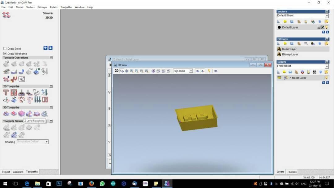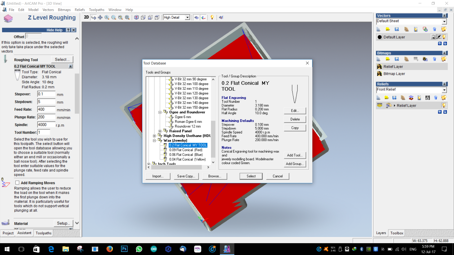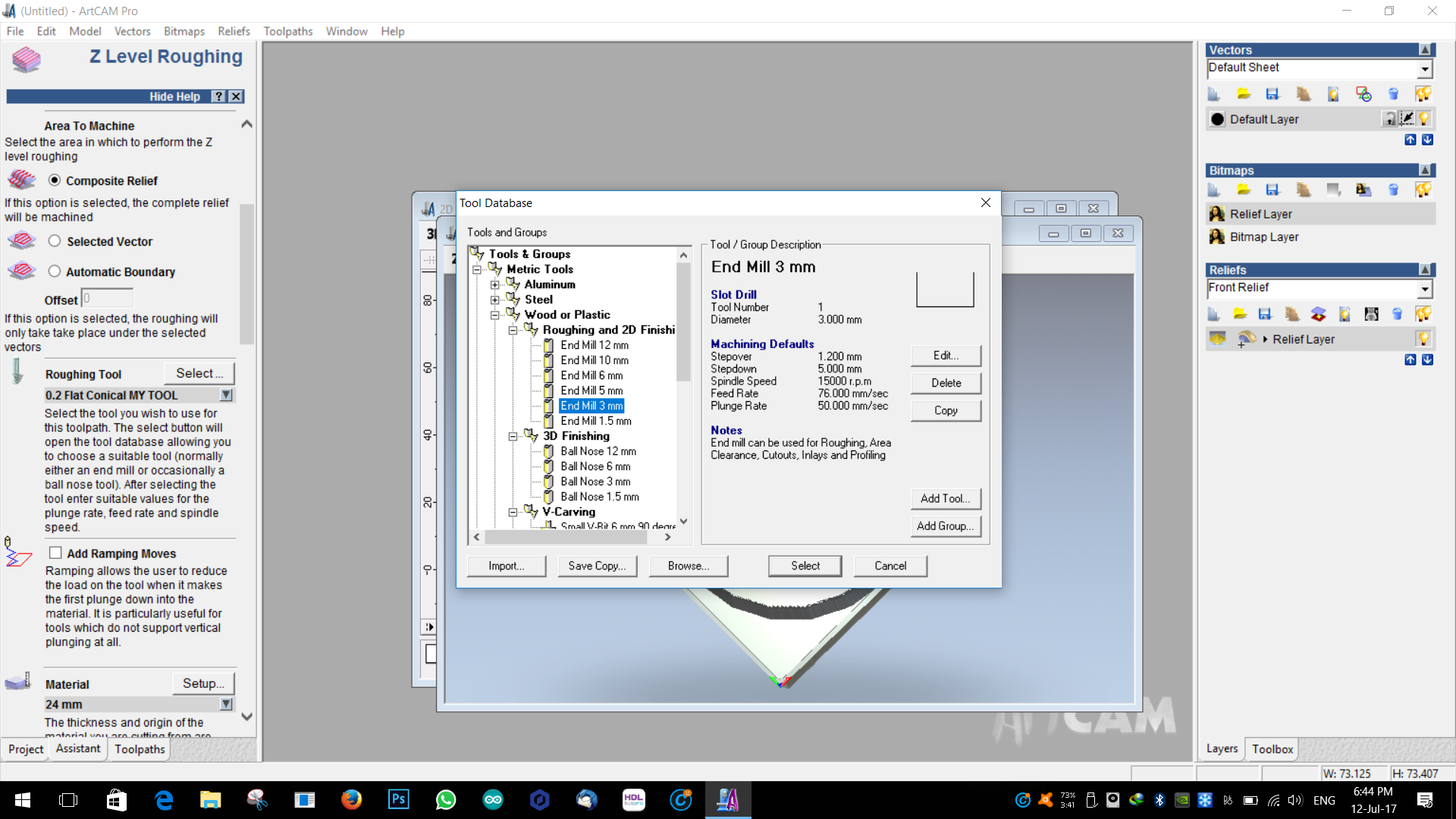 Click tool path → Select Z level Roughing → Roughing Tool → Select the bit from the list → Select Material ( before measure the wax thickness) –> gave the machine Z value → gave the name and click now.