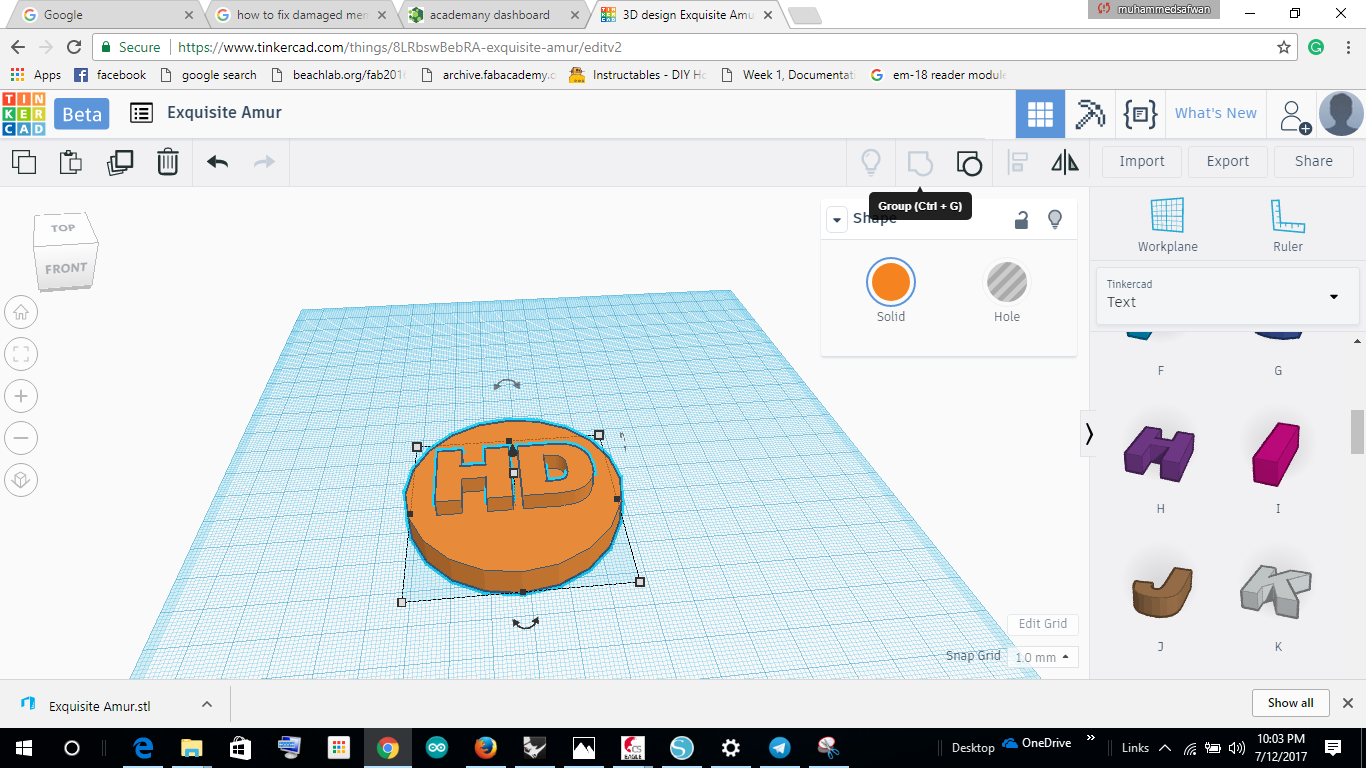 The next stage i select the text then i substract the text in to the cylinder shape then there is an option for grouping is called "group".i select all the design then i grouped.