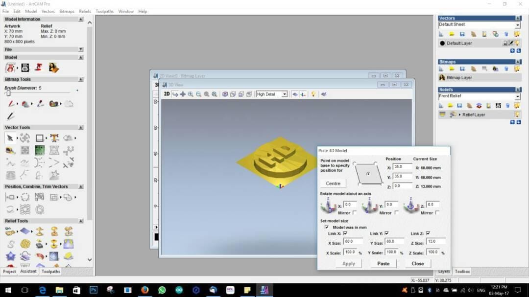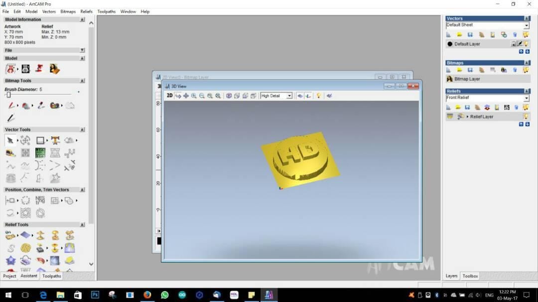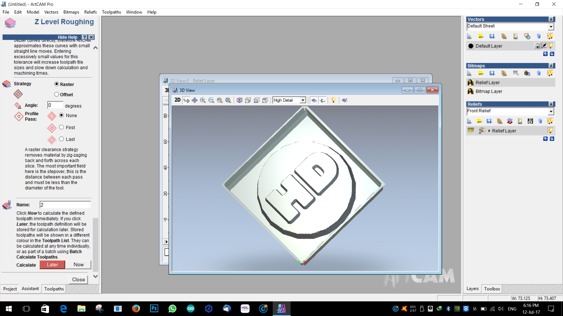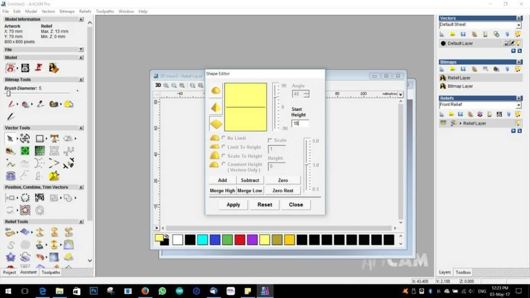 starting from down. We have to change that; therefore, click 2D → create grey scale bitmap then create a square of the 2D picture and double click. In that time we can see the picture below that I gave 18 mm start height ( depth of the design from the material) –> Subtract → Zero Rest → Apply → close-→ 3D.