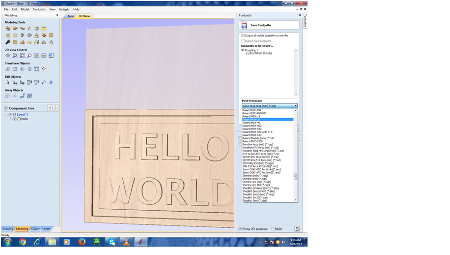 I exported the toolpaths using the roland modela mdx20 postprocessor