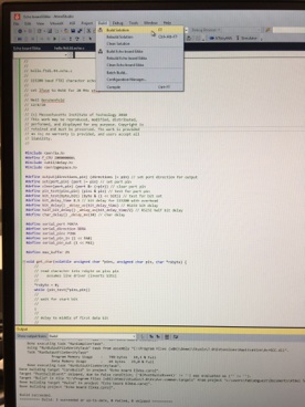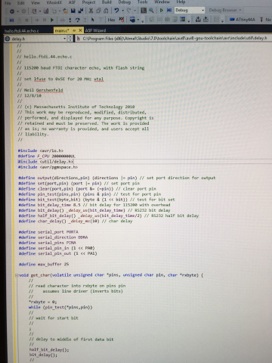 I opened hello.ftdi.44.echo.c code and defined crystal frequency in it after that I saved it. Next step was making a .hex code by using Atmel Studio Build -> Build solution tool.