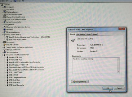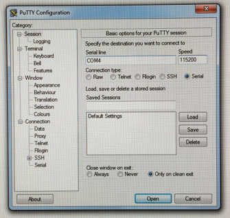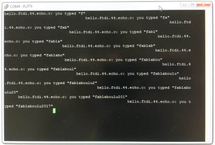 Now programming is done and next I need to test my board and is it working so I changed to Windows OS and connected my board to computer with FTDI cable. Then I opened windows device controls and checked which port FTDI cable and my board is connected. I find out that correct port is COM4. Then I opened Putty terminal and connected to COM4 serial port. First I tried using default speed 9600 but it didn´t work so I change speed to 115200 and then it worked. I typed fablaboulu2017 and result is seen below.