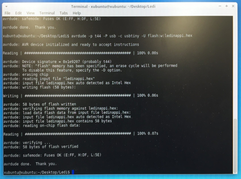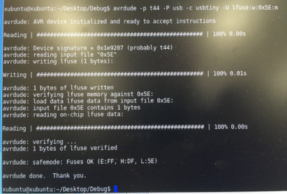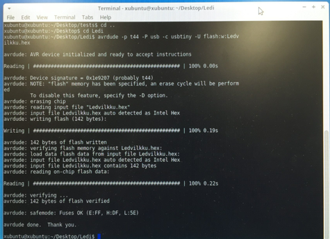 Again for some reason my programmer didn´t work so I changed it to Jani Ylioja´s programmer just make sure that my helloworld board is fine and then programming went well. Ok, there has been so many problems with my programmer that I leave it for waiting better time to find out what is wrong with it and continued with Jani´s programmer. I also set fuses with command avrdude -p t44 -P usb -c usbtiny -U lfuse:w:0x5E:m.