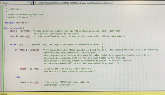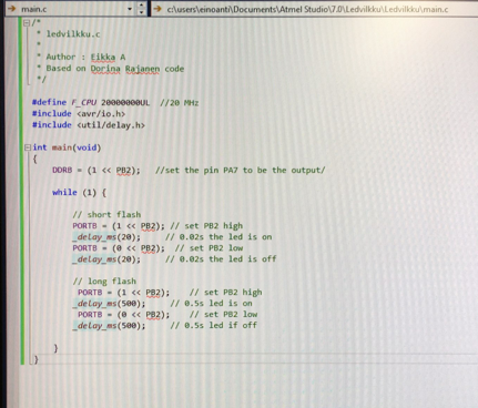 First I opened again Atmel Studio. My codes based on our lab staff Dorinna Rajanen codes. So I asked also Dorinna to help with code. I need just edit codes to be suitable to my board. There are couple thing I need to remember ATtiny44A have 8 pin port A (PORTA) and 4 pin port B (PORTB) then Pins are named PAX and PBX (X stands for pin number). For flashing led I need to define also my board crystal frequency and delay library. Then I just define in while loop which port is read and what happened and in which port depends on read value of input port. I checked ports in my board schematic and find out that input pin from button is PA7 and output pin for led is PB2. Then I just wrote codes which are shown below. Then I builded code just like with hello.ftdi.44.echo.c and get .hex file which I programmed to my board. Program changes also other PBX port values but this program works because there is no other PBX pins connected.