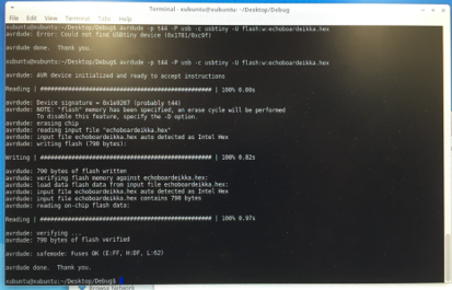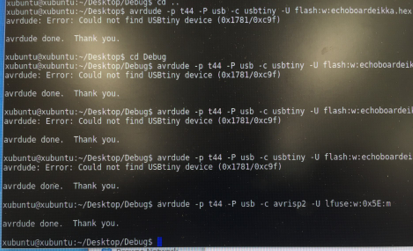 Command avrdude -p t44 -P usb -c usbtiny -U flash:w:echoboardeikka.hex will write .hex file to helloworld board memory. I renamed .hex file for easier to remind.