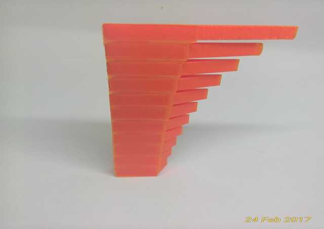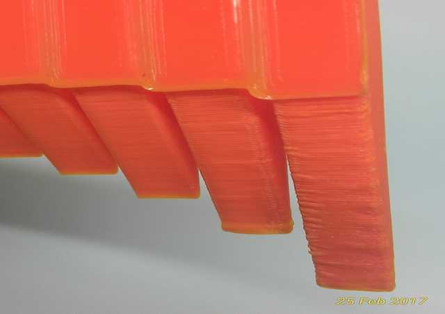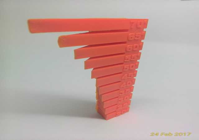 From the hang-over test, the maximum hang-over for Ultimaker 2+ is at 60 degree, surface is nice, end of tip is smooth and without extra support. At 65 degree even without extra support, starts to show slight uneven surface and end of tip slightly deformed. And at 70 degree also without extra support, can clearly see uneven surface and end of tip deformed.