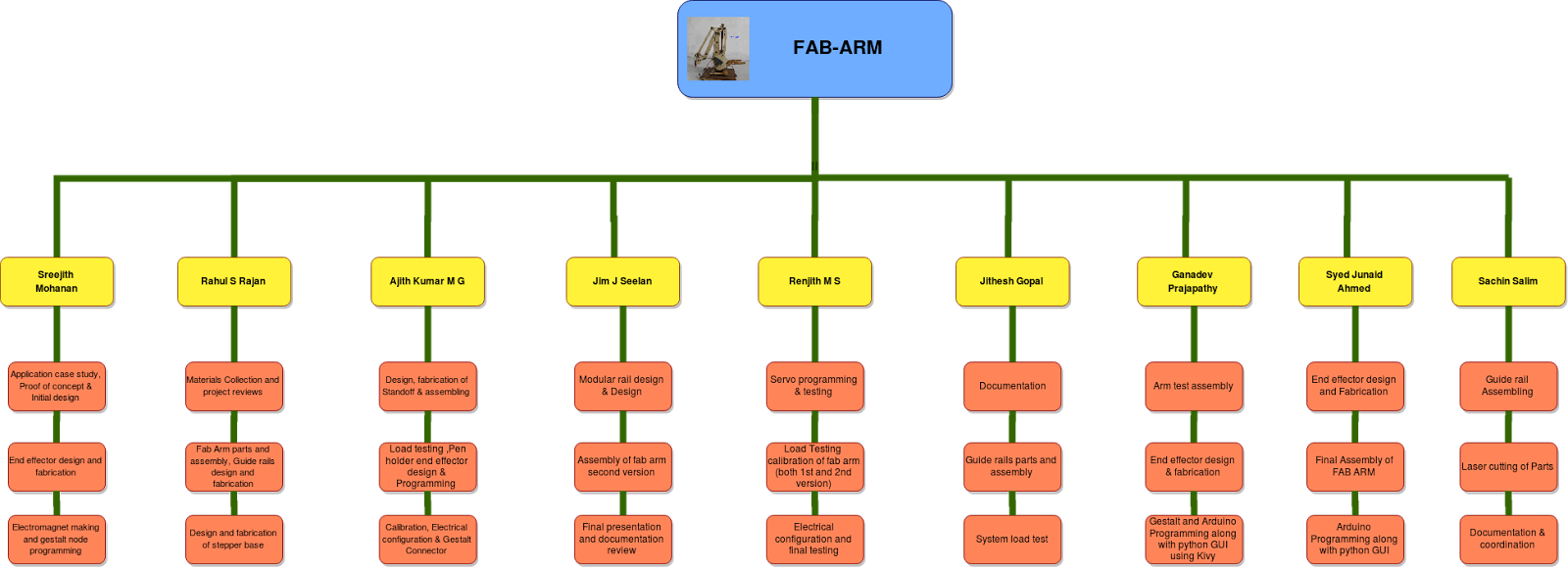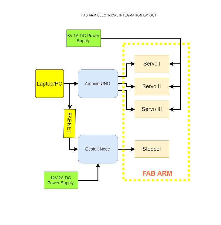 Fab Arm is based on U arm an open source multipurpose desktop robotic hand. We chose the U arm because of the simplicity of its design, there are no motors in the arm, all the electronics are contained in the base itself. This makes the arm even more responsive and simpler in construction. We did not want to start from scratch when a lot of people have already worked on many designs. Hence taking into consideration the amount of time we have, we decided to take an existing design and augment it. We will make a fab version of the U arm with some modification and extra functionalities like a linear rail system for the arm to move about.Delegation of work