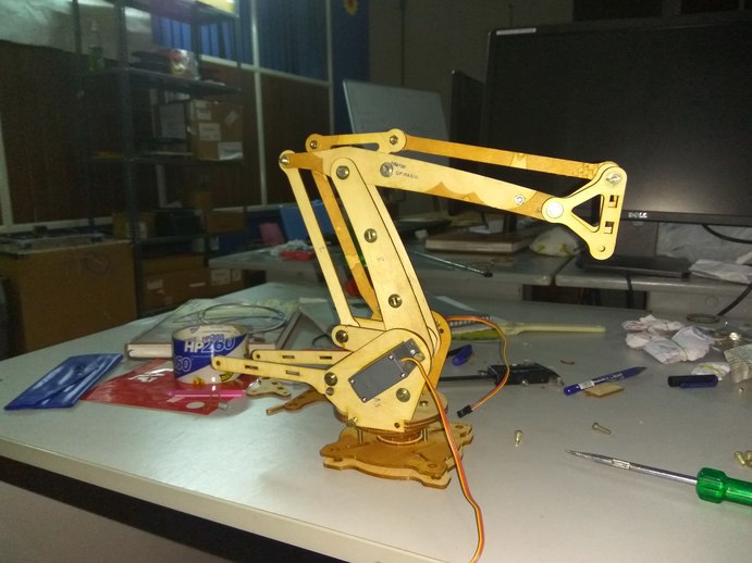 After cutting the parts, we started assembling it with the screws and other fasteners by referring the assembly instructions form the uarm documentation page. Assembling the servos into the side plates was the difficult part of the build since, it is having a lots of parts and fasteners with different sizes. It's taken almost 6 hours to complete the assembly. The selfie with Fab-arm was awesome ,because we have finished it in morning 2:15 am.