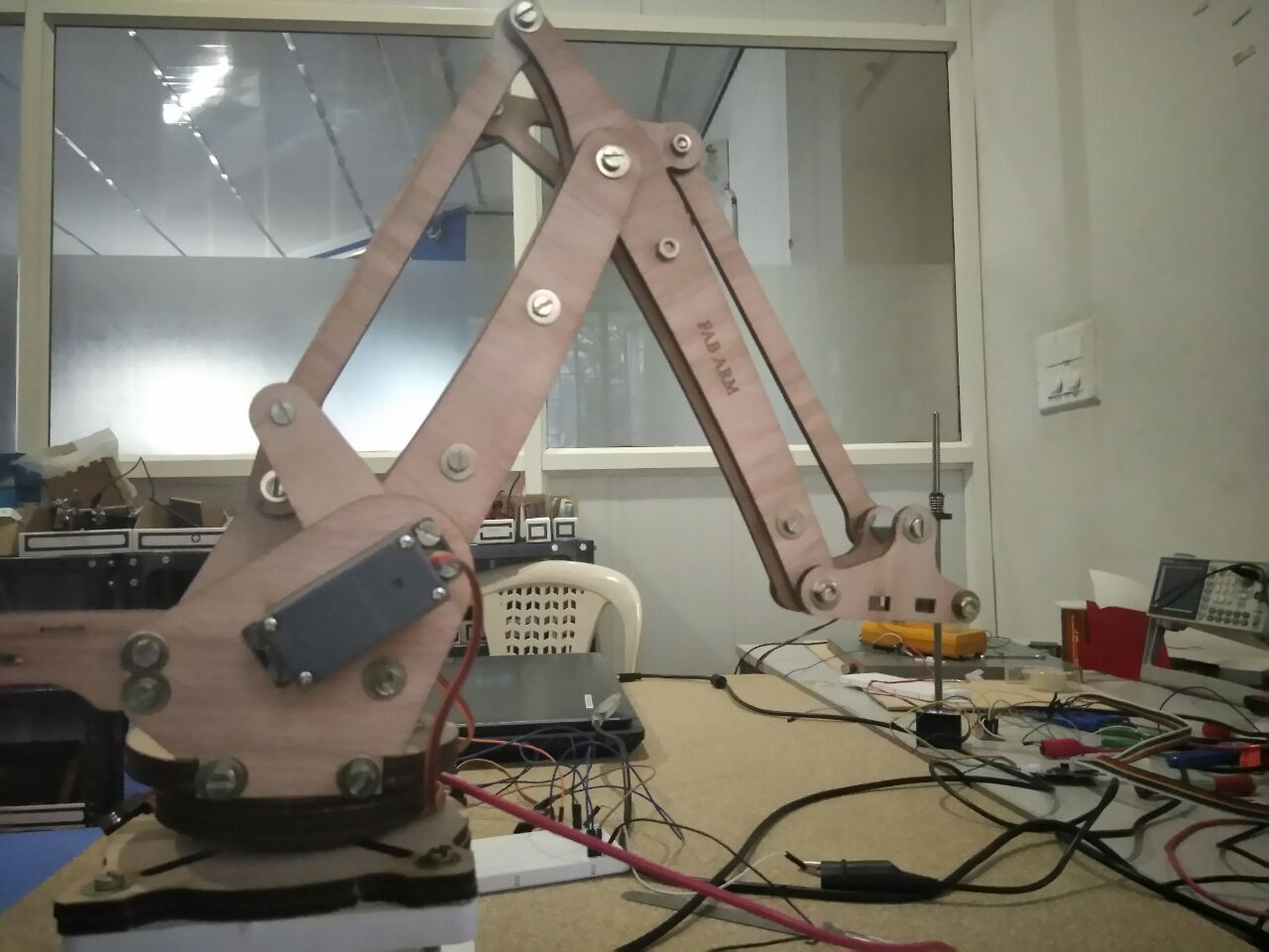 Load testing is performed to determine the maximum torque of the motor under different load conditions. We have Hobbyking HK15138 standard analog servo which is having a torque of 4.3Kg at 6V, first we have to test it with our arm before integrating it to the arm. After completing the arm assembly the servo motor was integrated on the arm and we have done load testing, used Neodymium magnet as the load . Placed equal quantity of magnets on the two sides of the arm on the M4 screws and done the test. We found that at 5V the arm is capable to a maximum load of 60 grams and the craft wood arm parts weighed around 59 grams . So in total it taken maximum 110gm of load at 5V. In our case we don't have any higher torque servos available in our lab . So we planned to use this for the first version prototype and to procure new servos or to replace with stepper with higher torque for our final prototype.Servo programming and calibration