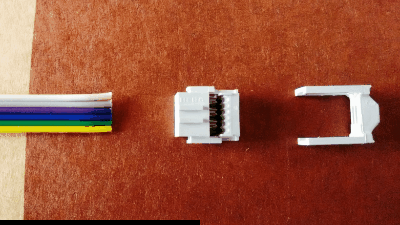 A bus connector is required to connect the headers of the fabISP to another boardfor programming. This is made by taking a 1 foot long 6-strand ribbon wire and then snapping the 2 piece connector as shown in the animation below.