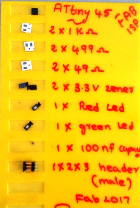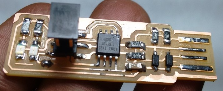 This week, we are learning to do some basic electronics production, specifically creation of a PCB by milling, then stuffing the components and finally burning the code to it. This is something which I have never attempted before. As part of the assignments this week we need to make an in-circuit programmer (FabISP) by milling the PCB. The FabISP is an in-system programmer for AVR microcontrollers, designed for production within a FabLab. It allows us to program the microcontrollers on other boards we make in our coming weeks activities. We have chosen the FabTinyISP Minimal version which uses a ATtiny45.